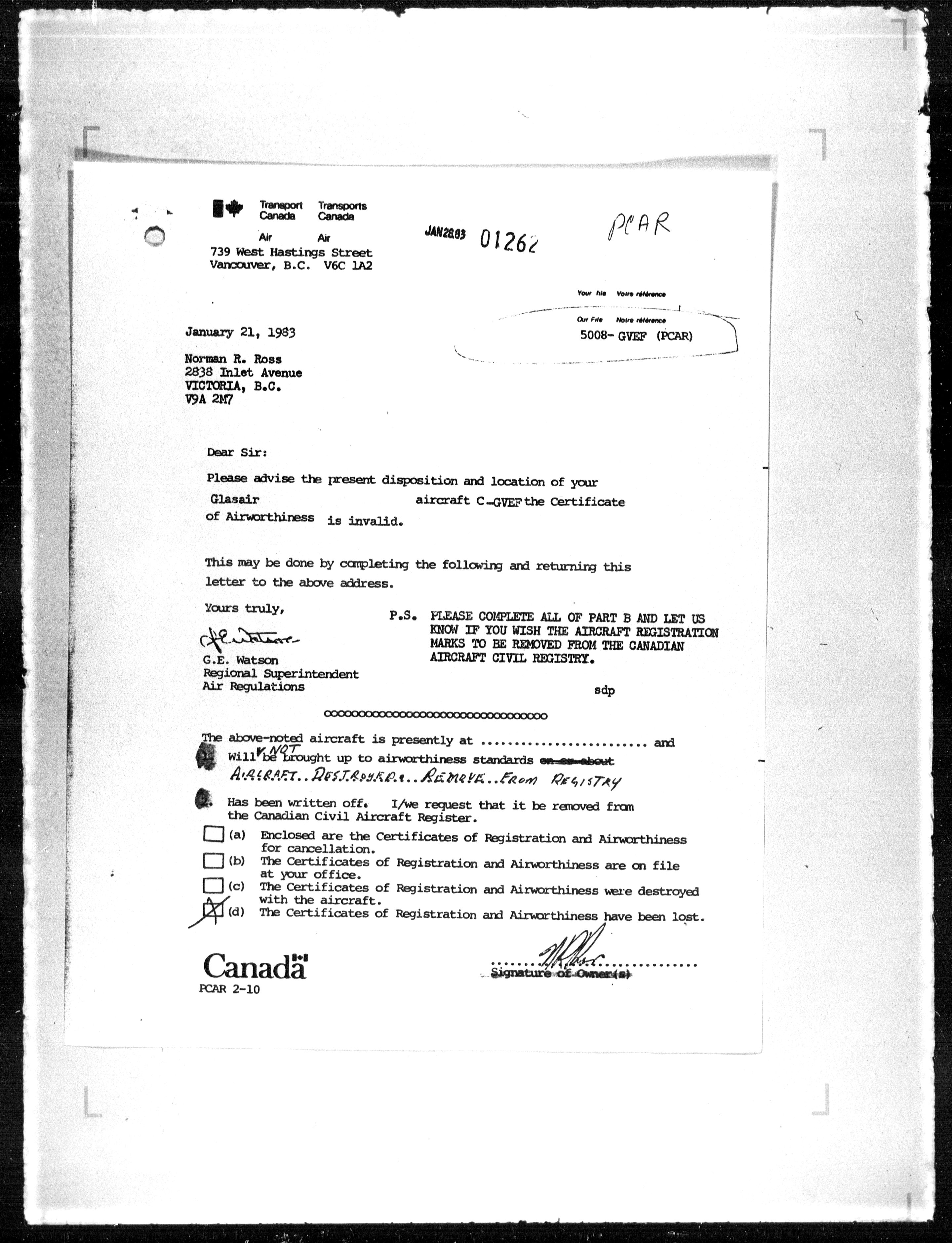 Department of Transport : Civil aircraft registration, inspection and operation files, block 5008, 1920-1986 - 7883