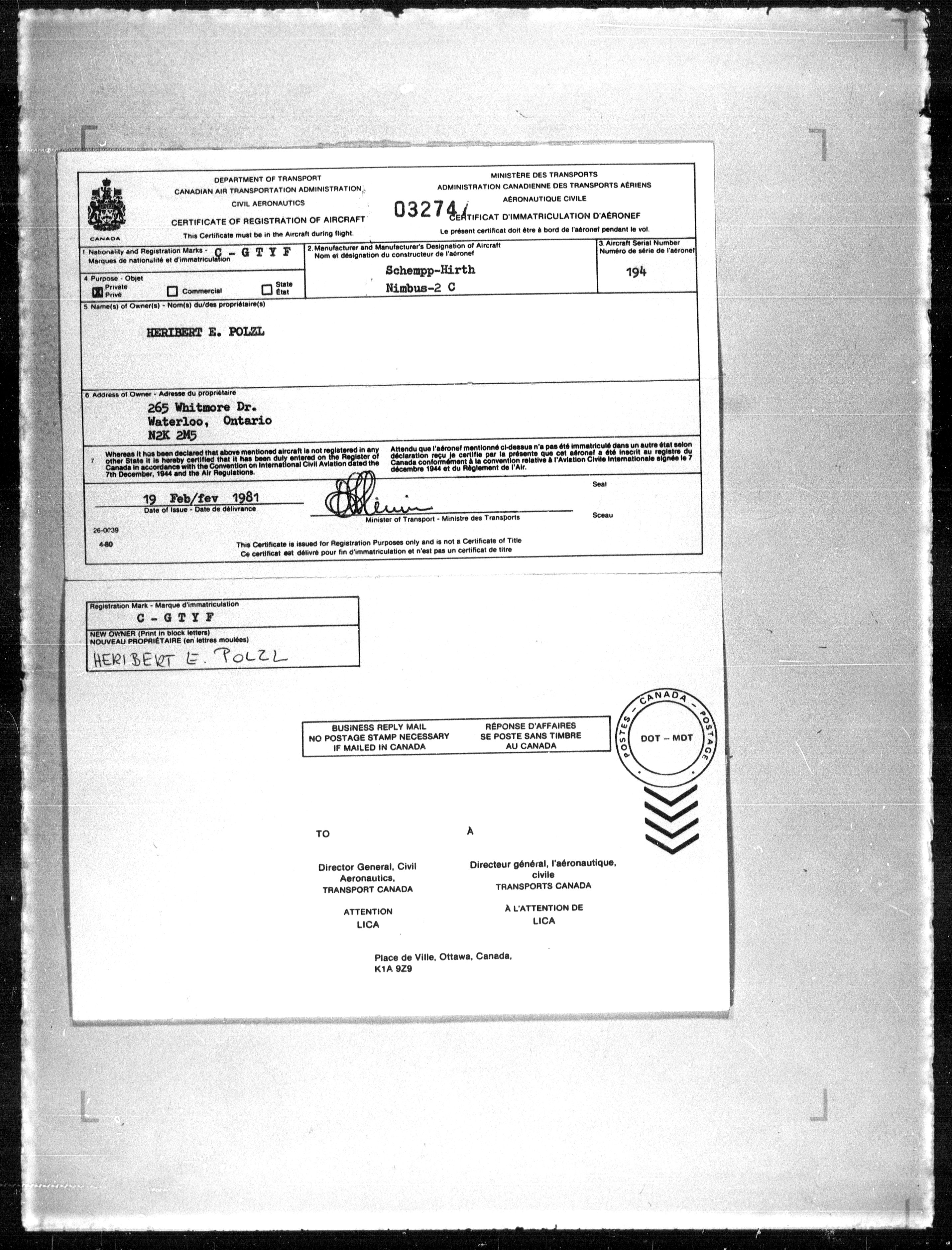 Department of Transport : Civil aircraft registration, inspection and operation files, block 5008, 1920-1986 - 7883