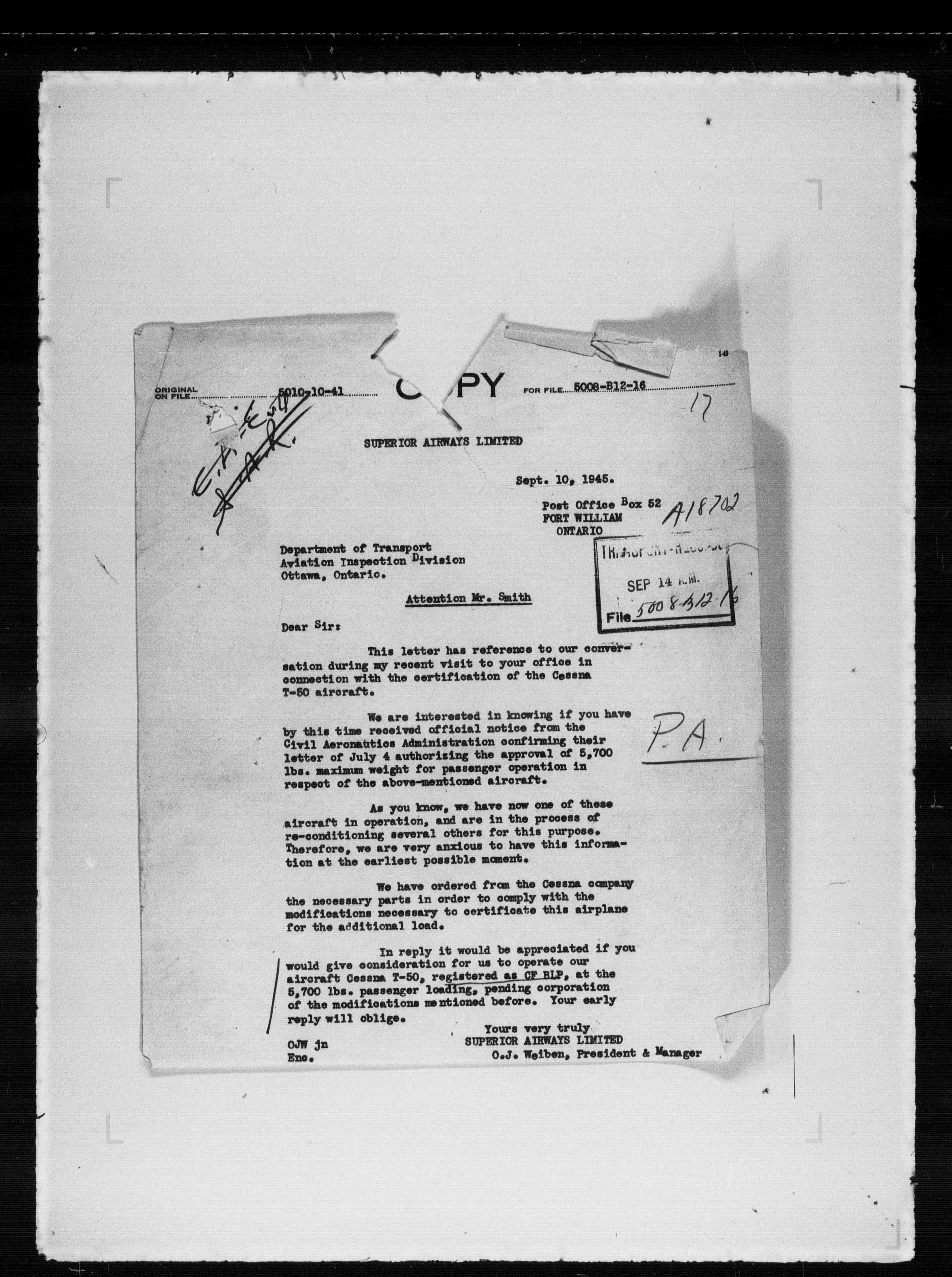 Department of Transport : Civil aircraft registration, inspection and operation files, block 5008, 1920-1986 - 7888