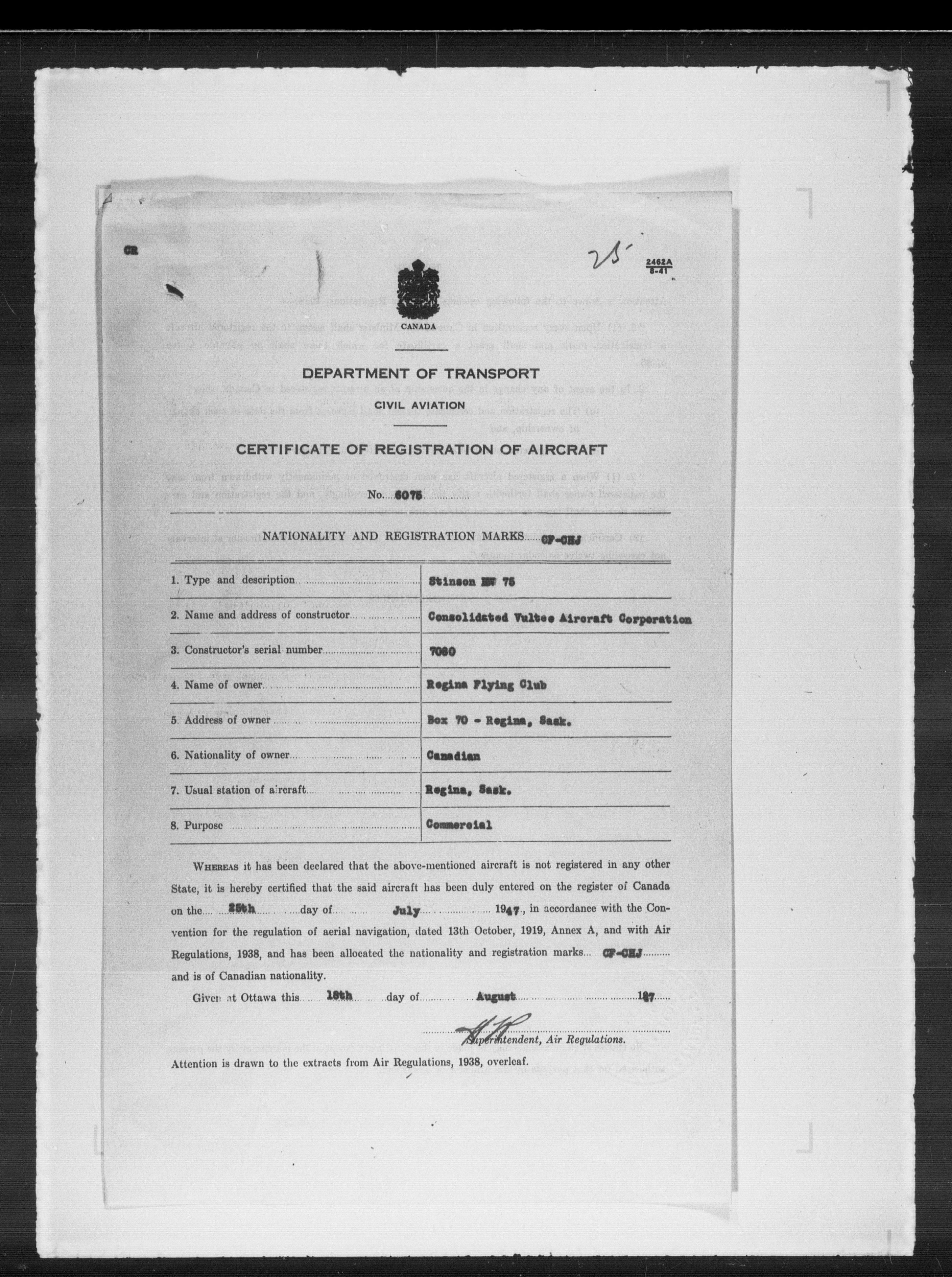 Department of Transport : Civil aircraft registration, inspection and operation files, block 5008, 1920-1986 - 7890