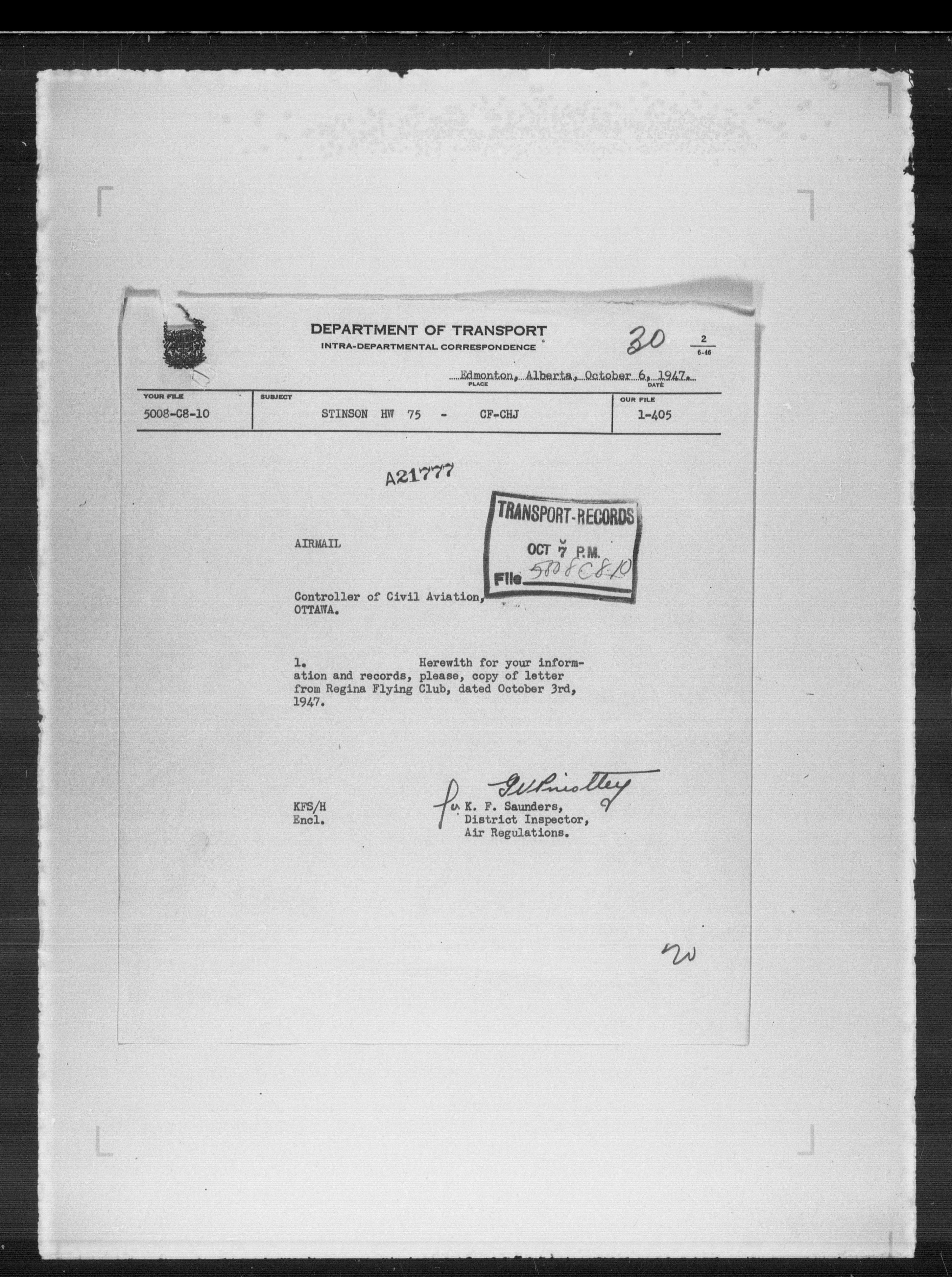 Department of Transport : Civil aircraft registration, inspection and operation files, block 5008, 1920-1986 - 7890
