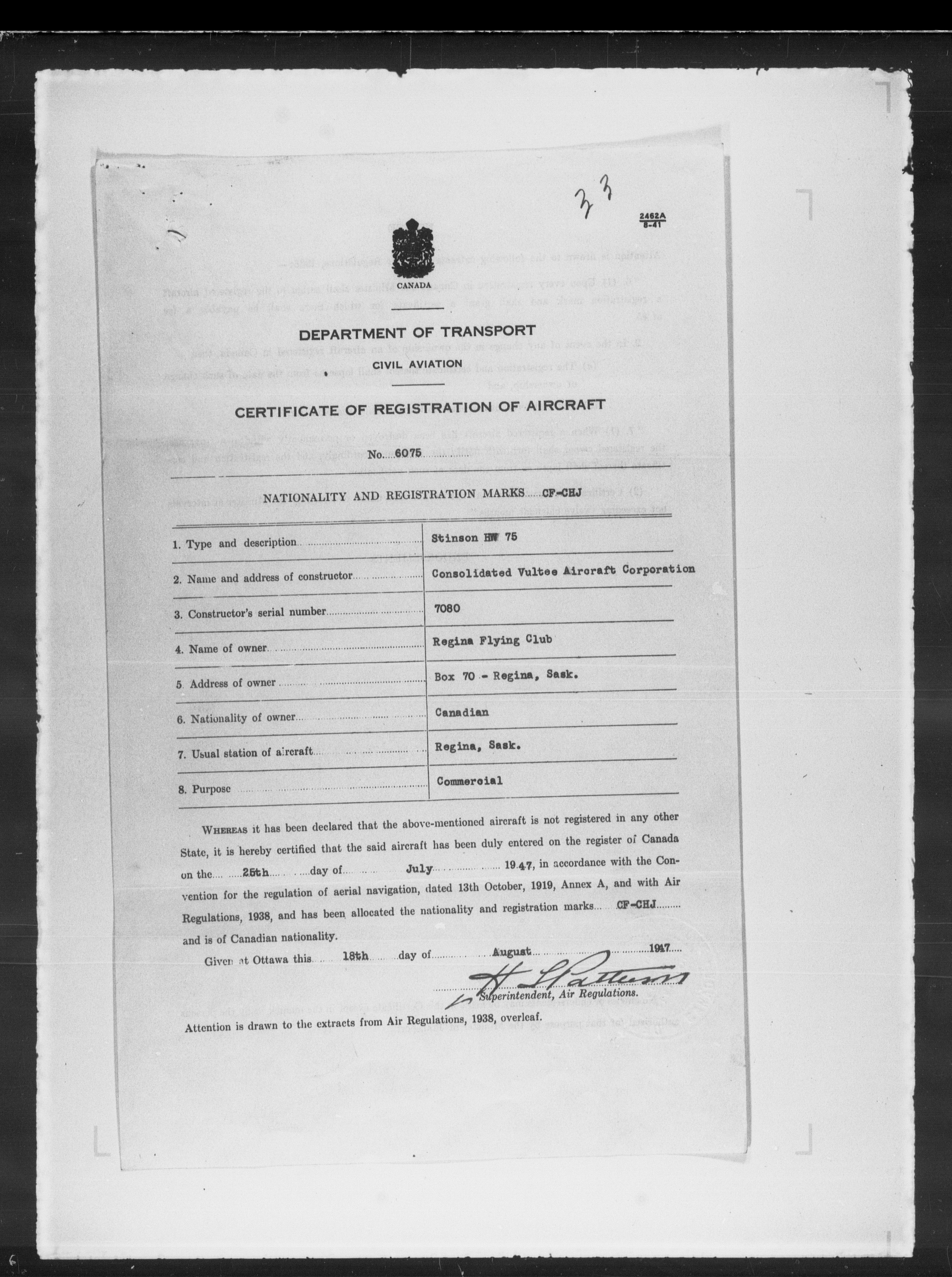 Department of Transport : Civil aircraft registration, inspection and operation files, block 5008, 1920-1986 - 7890
