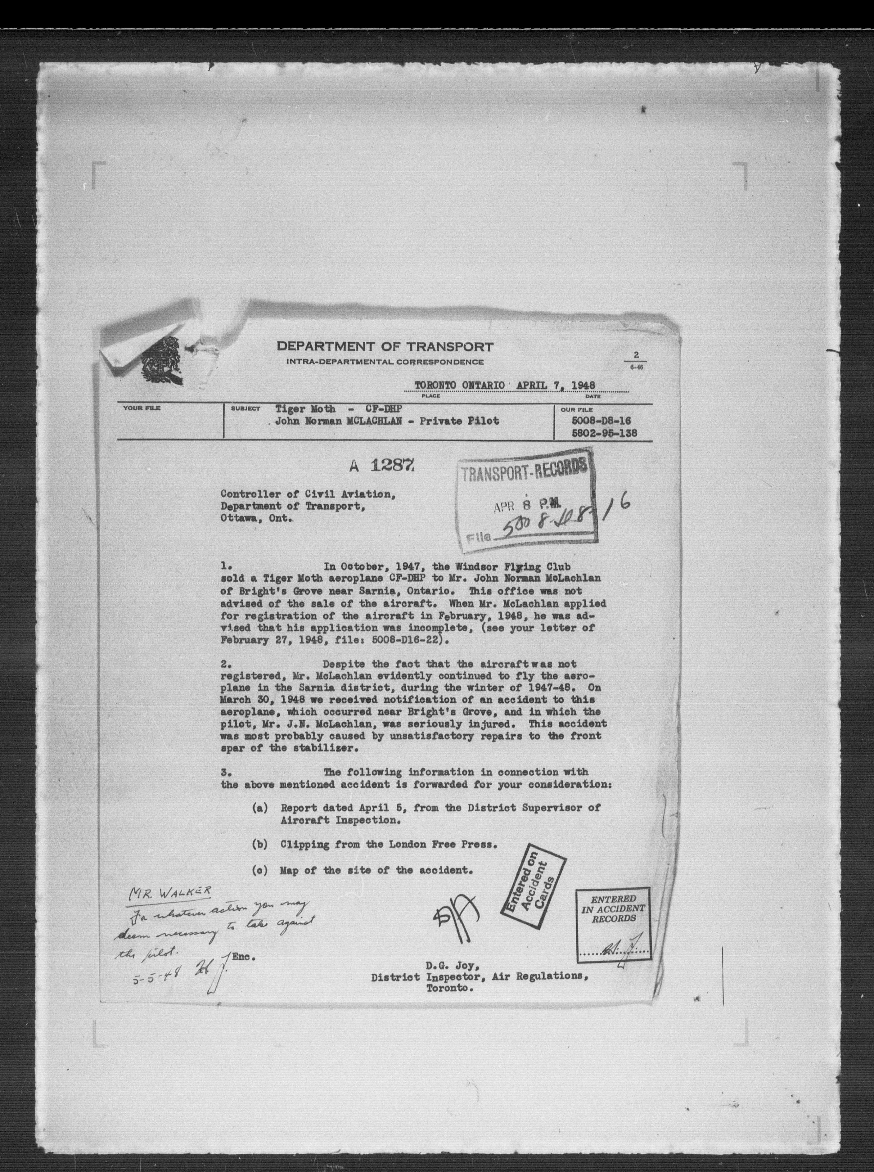 Department of Transport : Civil aircraft registration, inspection and operation files, block 5008, 1920-1986 - 7895