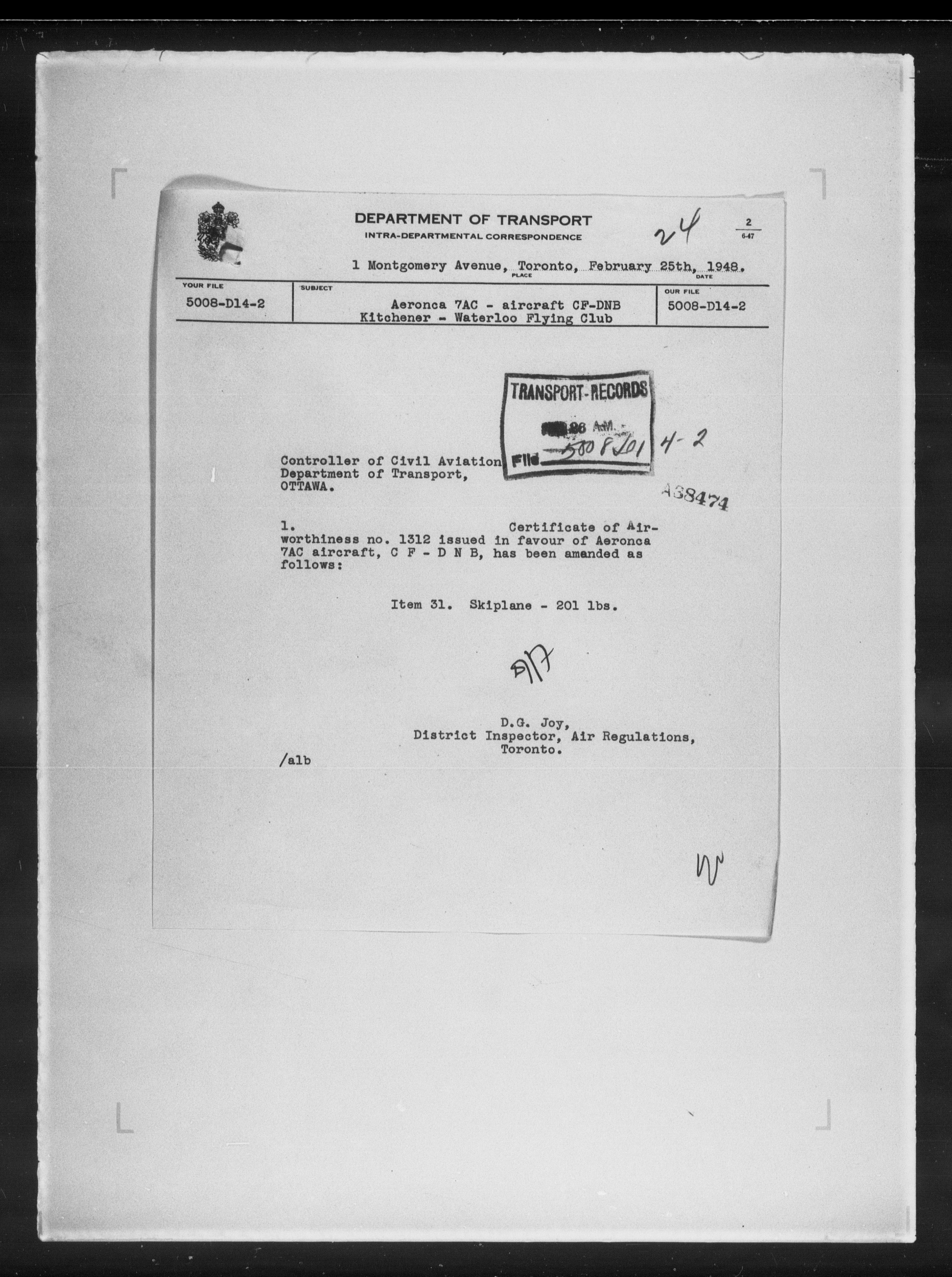Department of Transport : Civil aircraft registration, inspection and operation files, block 5008, 1920-1986 - 7896