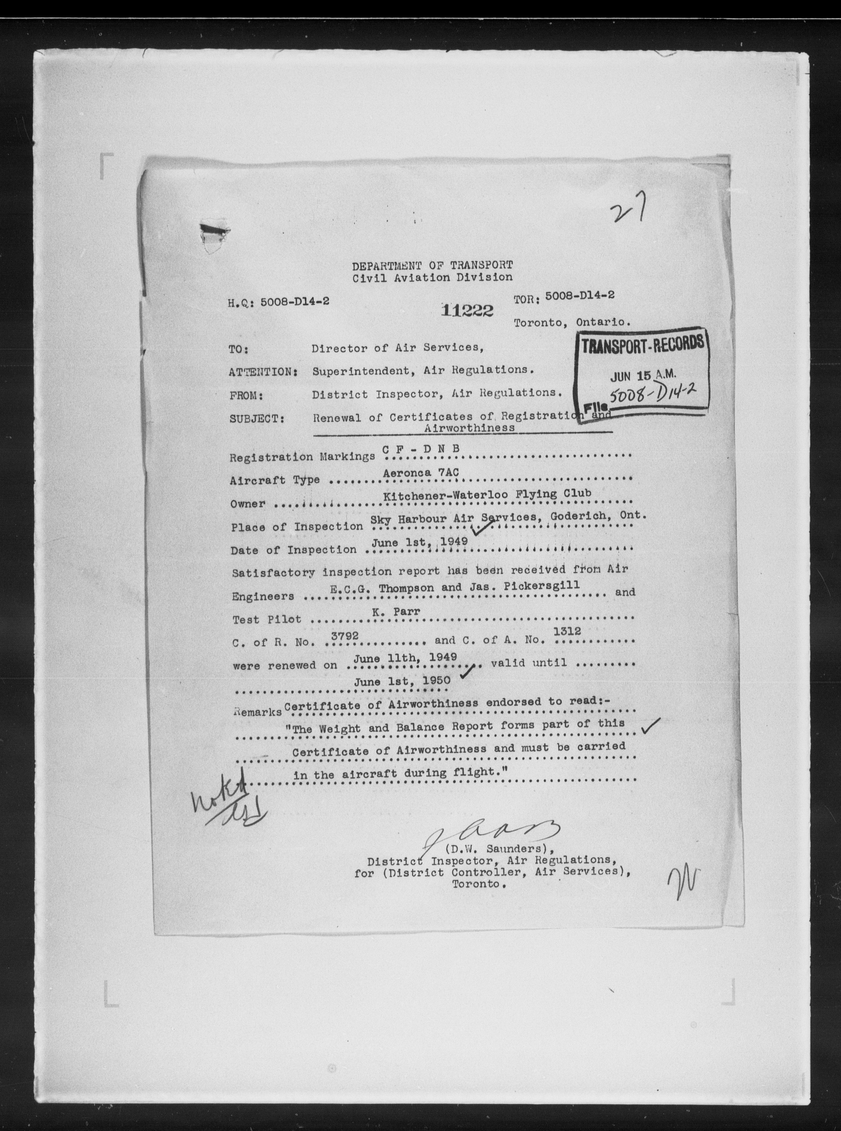 Department of Transport : Civil aircraft registration, inspection and operation files, 1920-1986 : T-7896