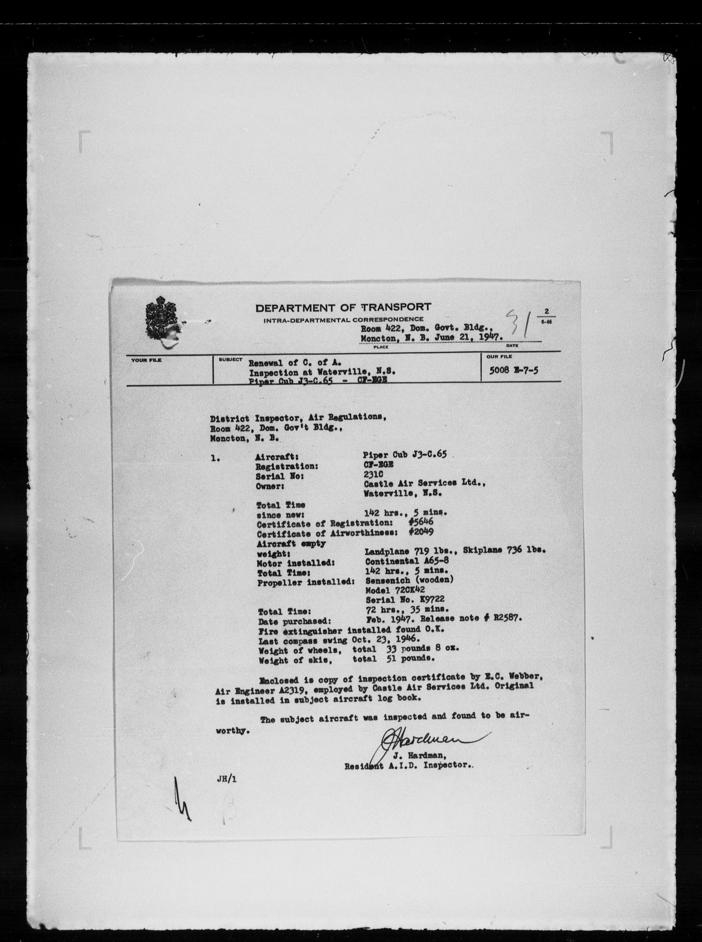 Department of Transport : Civil aircraft registration, inspection and operation files, block 5008, 1920-1986 - 7899