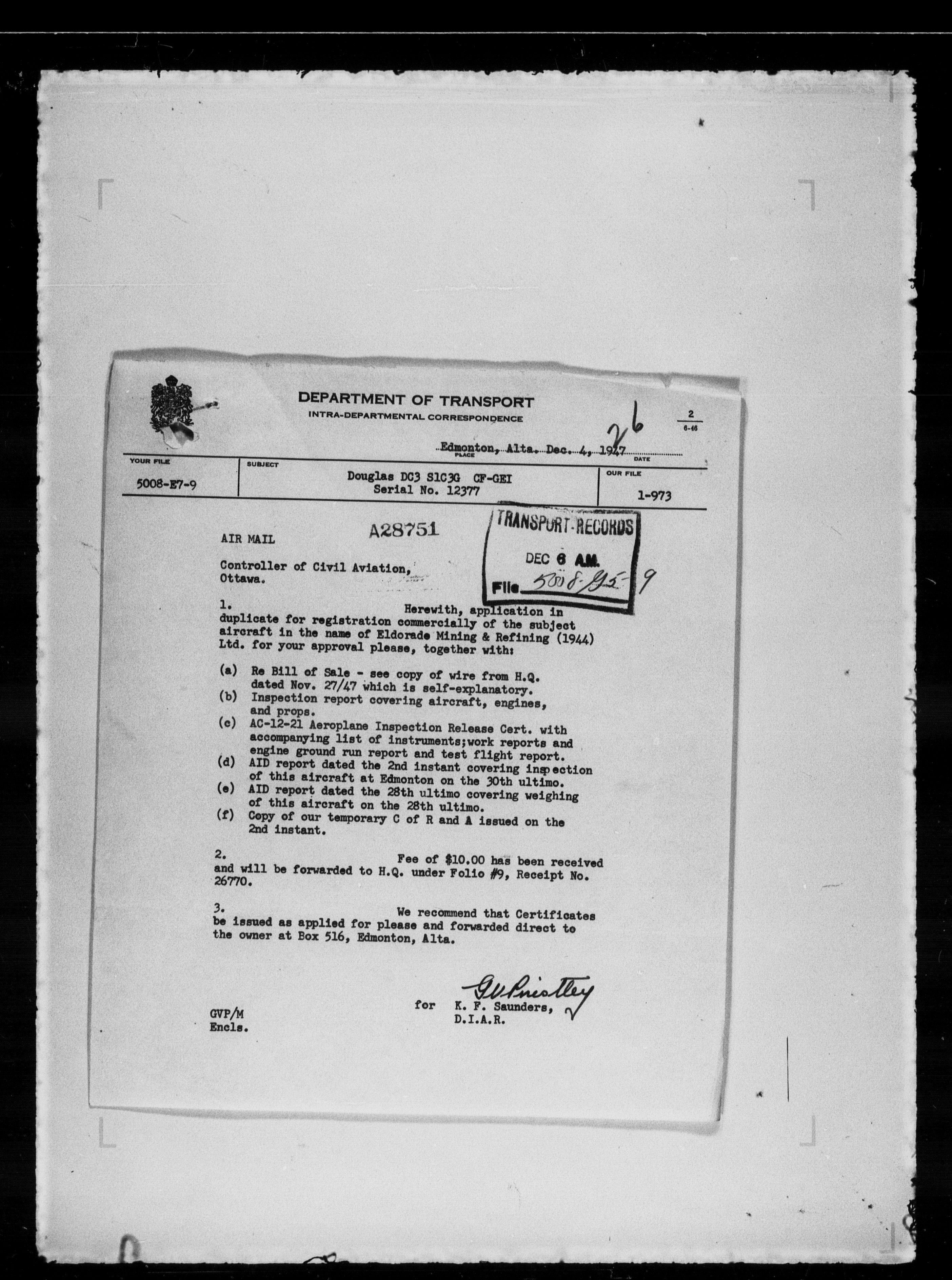 Department of Transport : Civil aircraft registration, inspection and operation files, block 5008, 1920-1986 - 7908