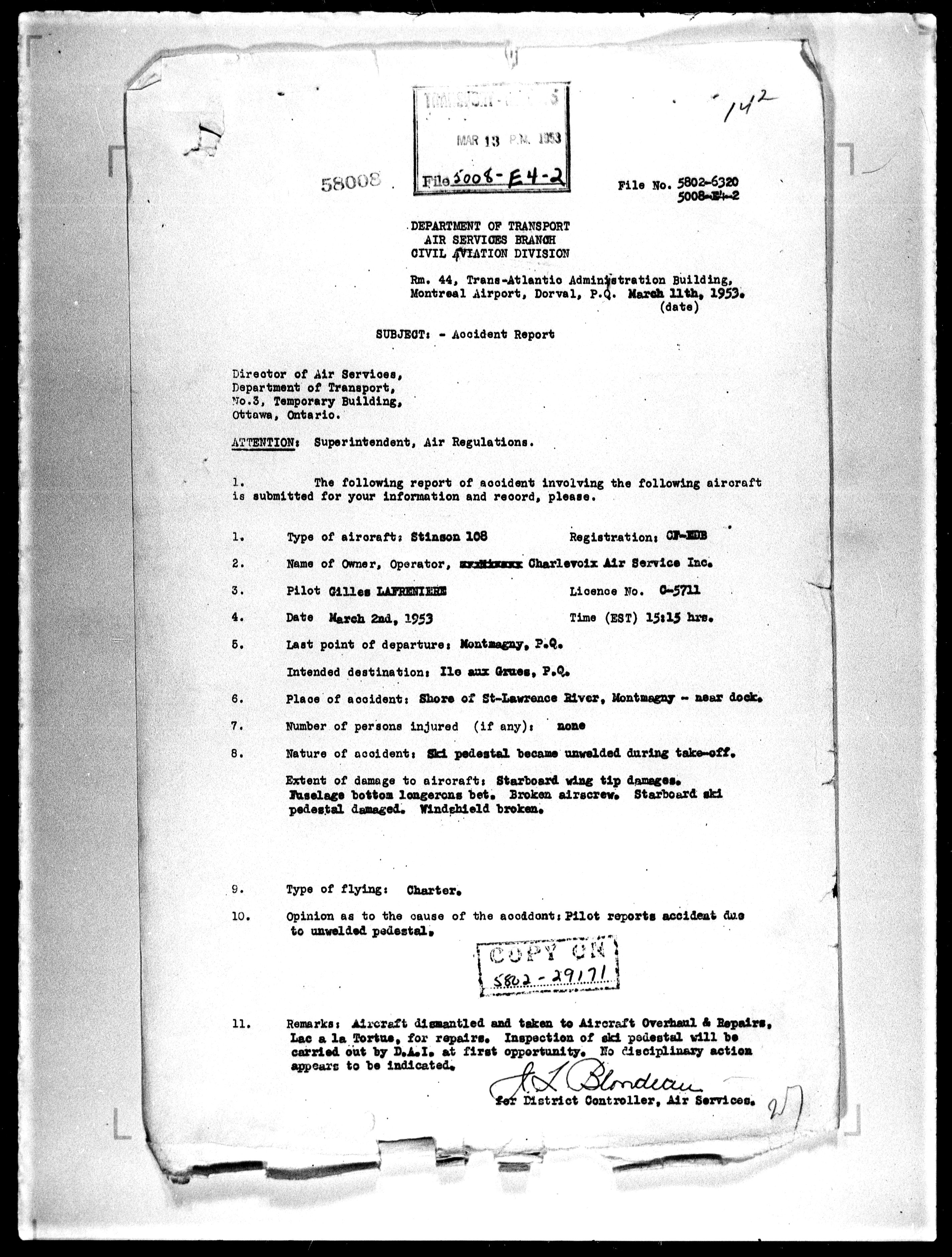 Department of Transport : Civil aircraft registration, inspection and operation files, 1920-1986 : T-7919