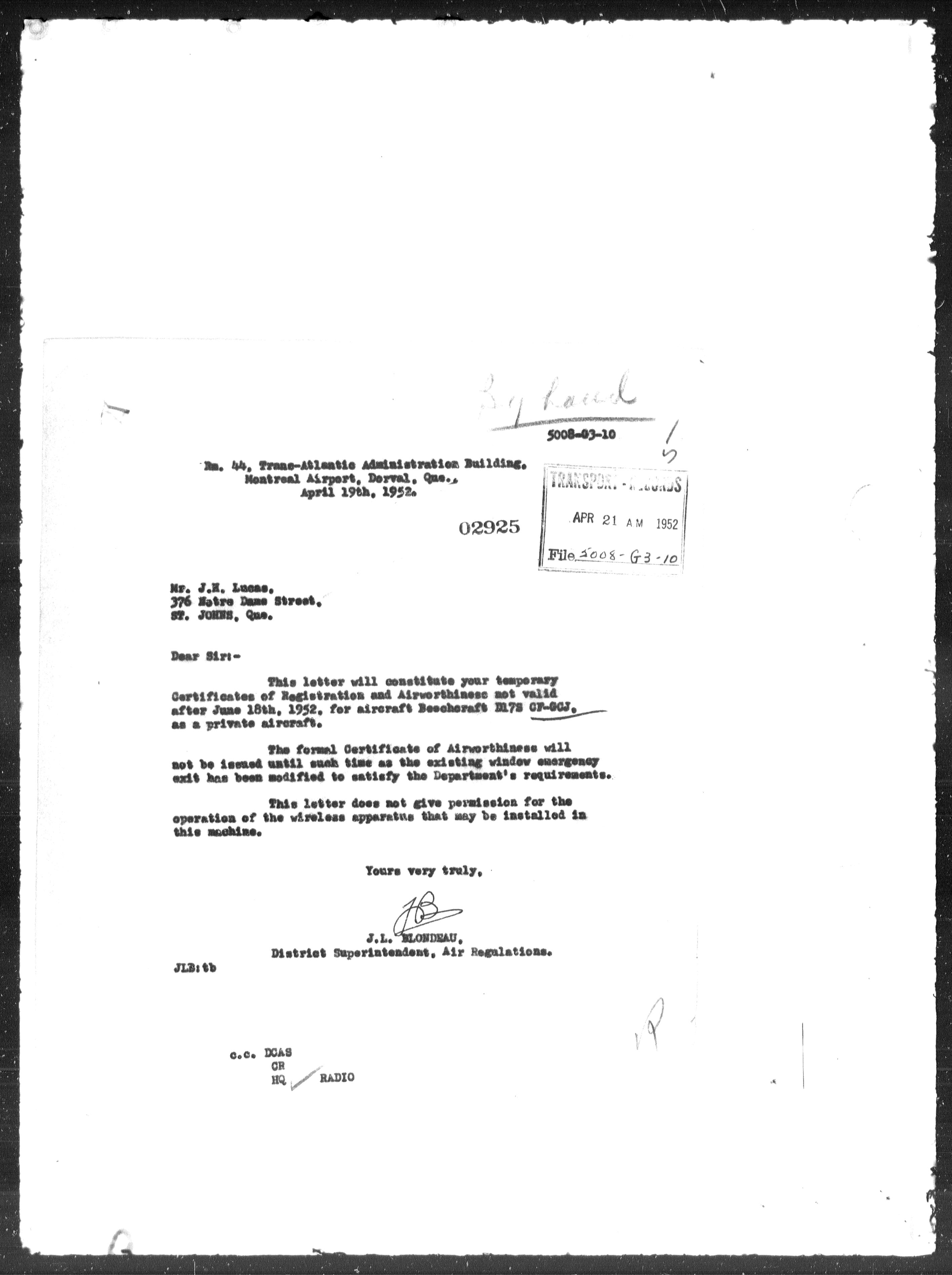 Department of Transport : Civil aircraft registration, inspection and operation files, block 5008, 1920-1986 - 7931