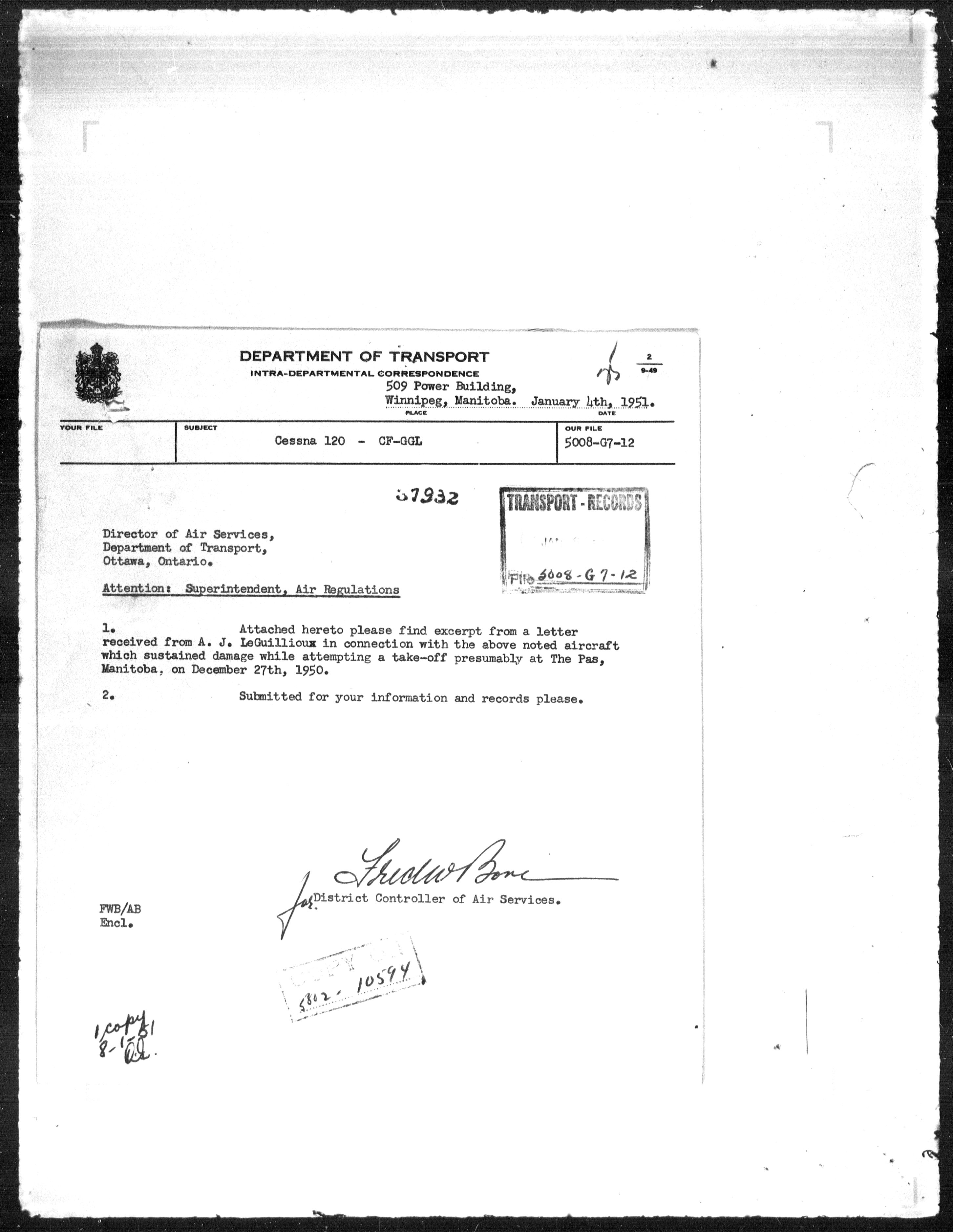 Department of Transport : Civil aircraft registration, inspection and operation files, block 5008, 1920-1986 - 7932