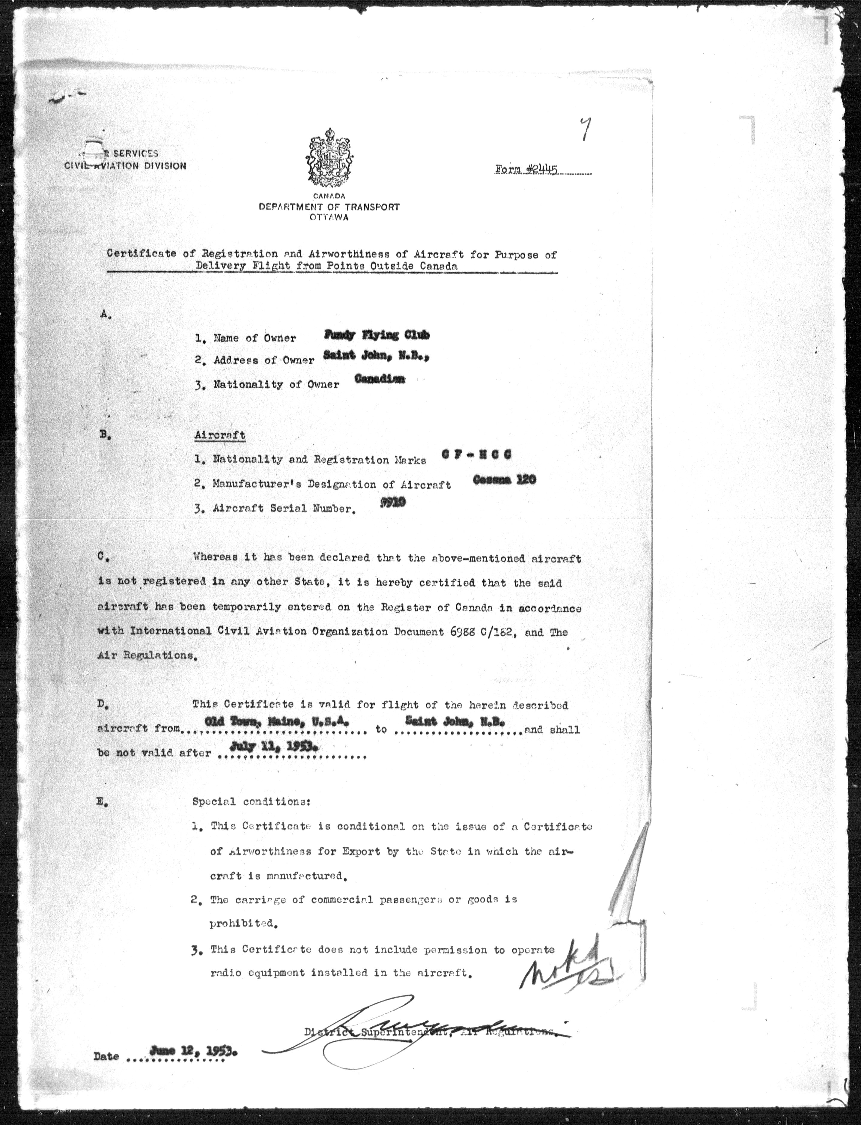 Department of Transport : Civil aircraft registration, inspection and operation files, block 5008, 1920-1986 - 7935