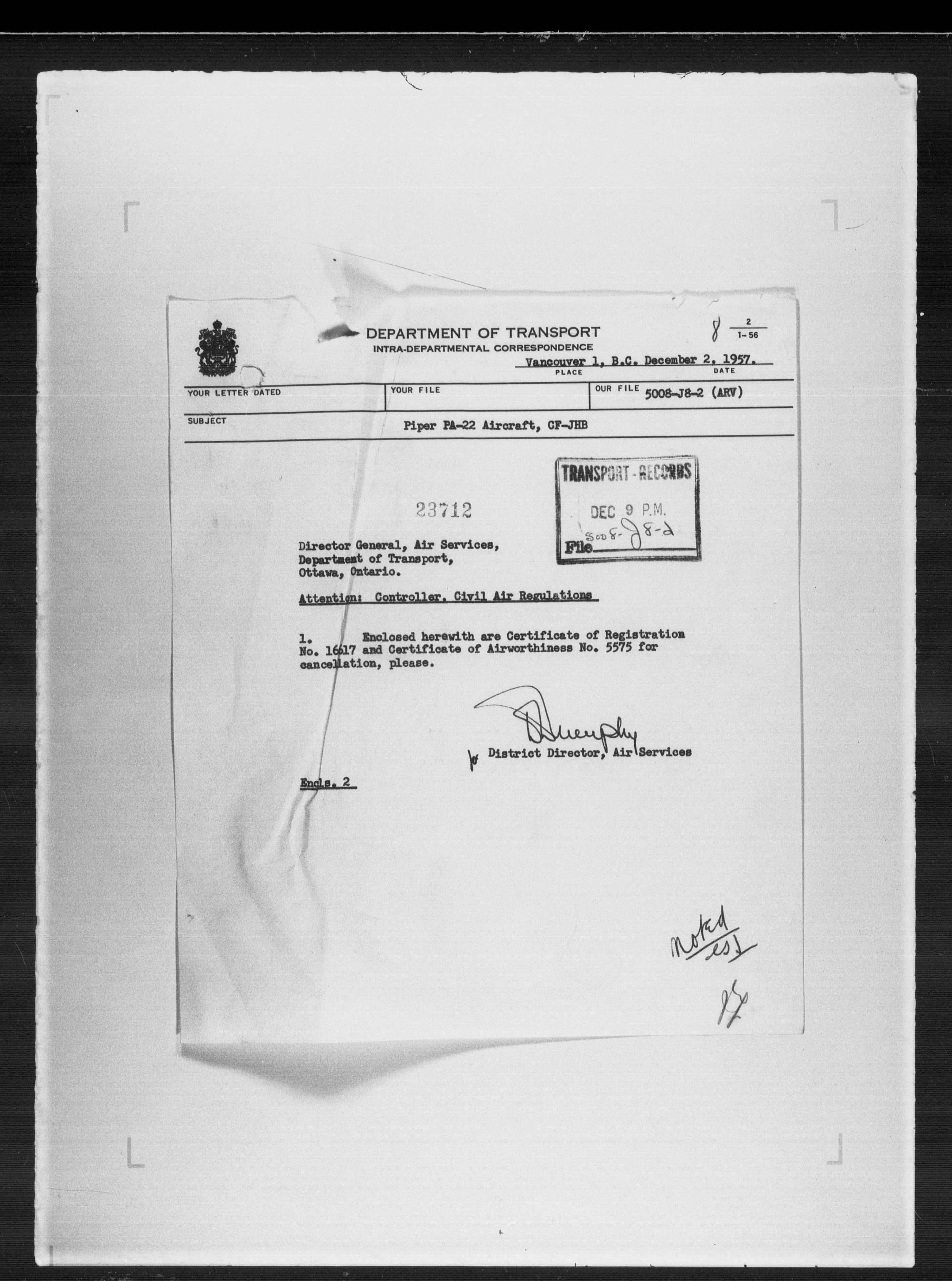 Department of Transport : Civil aircraft registration, inspection and operation files, block 5008, 1920-1986 - 7939