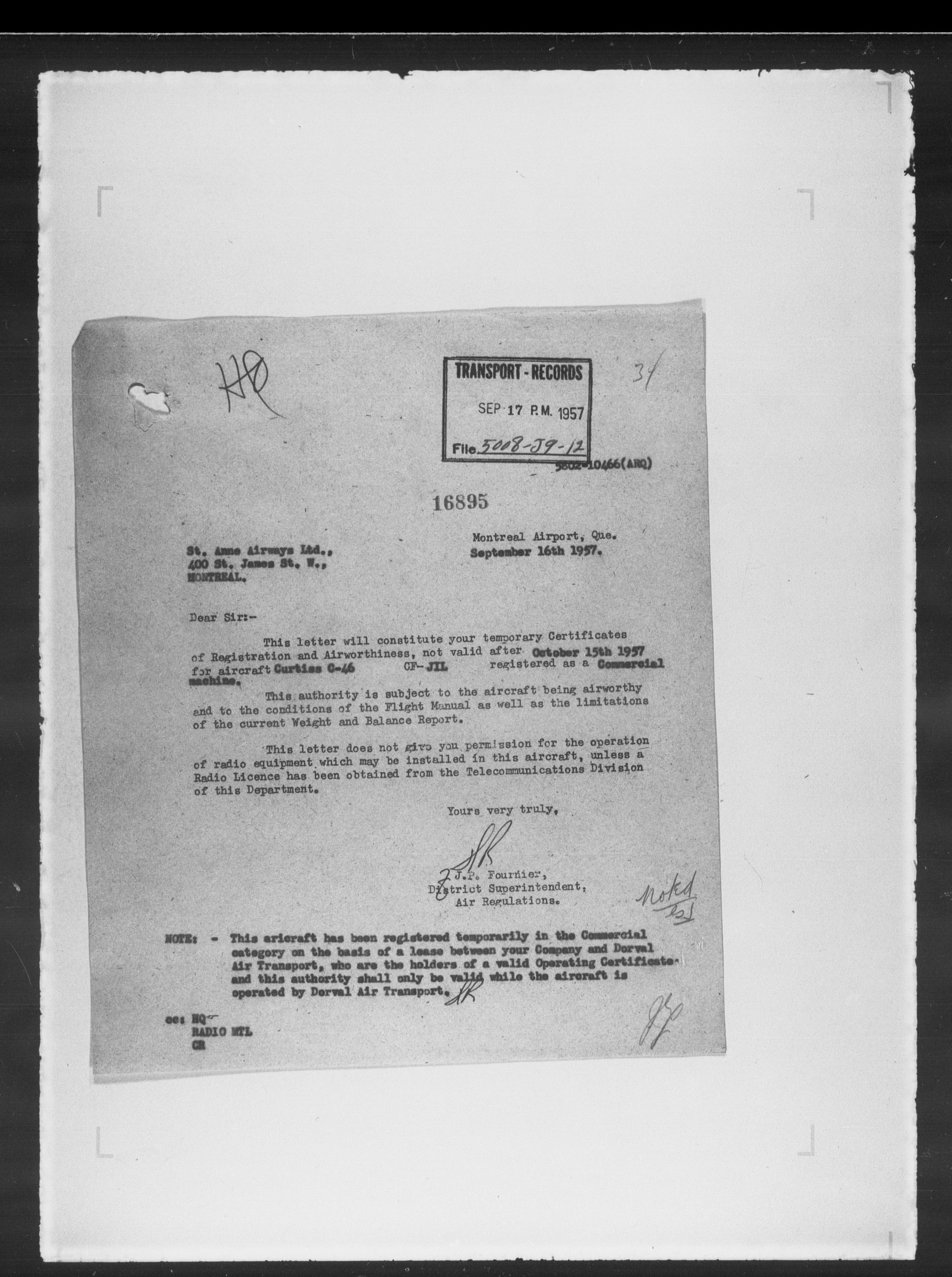 Department of Transport : Civil aircraft registration, inspection and operation files, 1920-1986 : T-7940