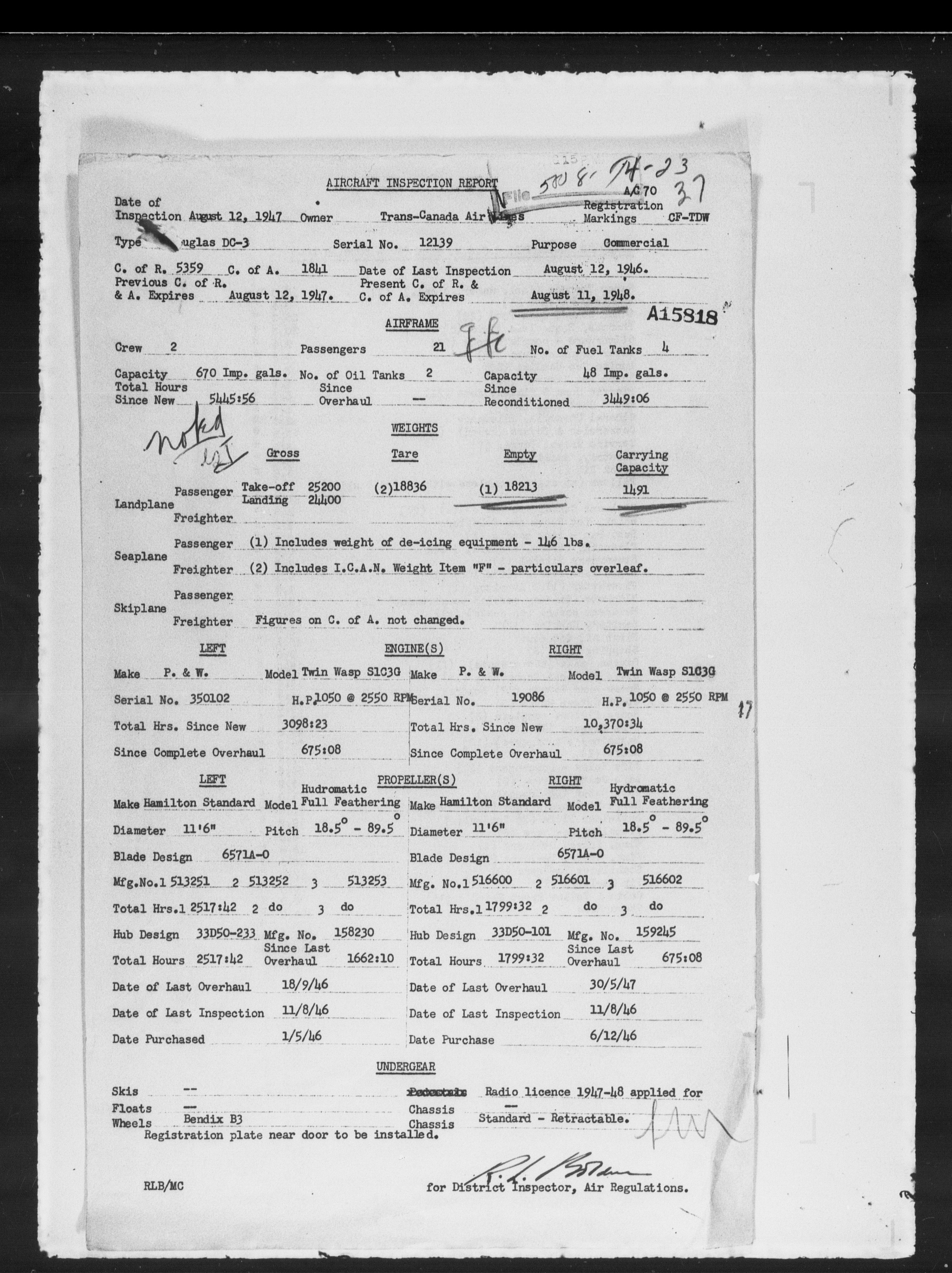 Department of Transport : Civil aircraft registration, inspection and operation files, block 5008, 1920-1986 - 7941