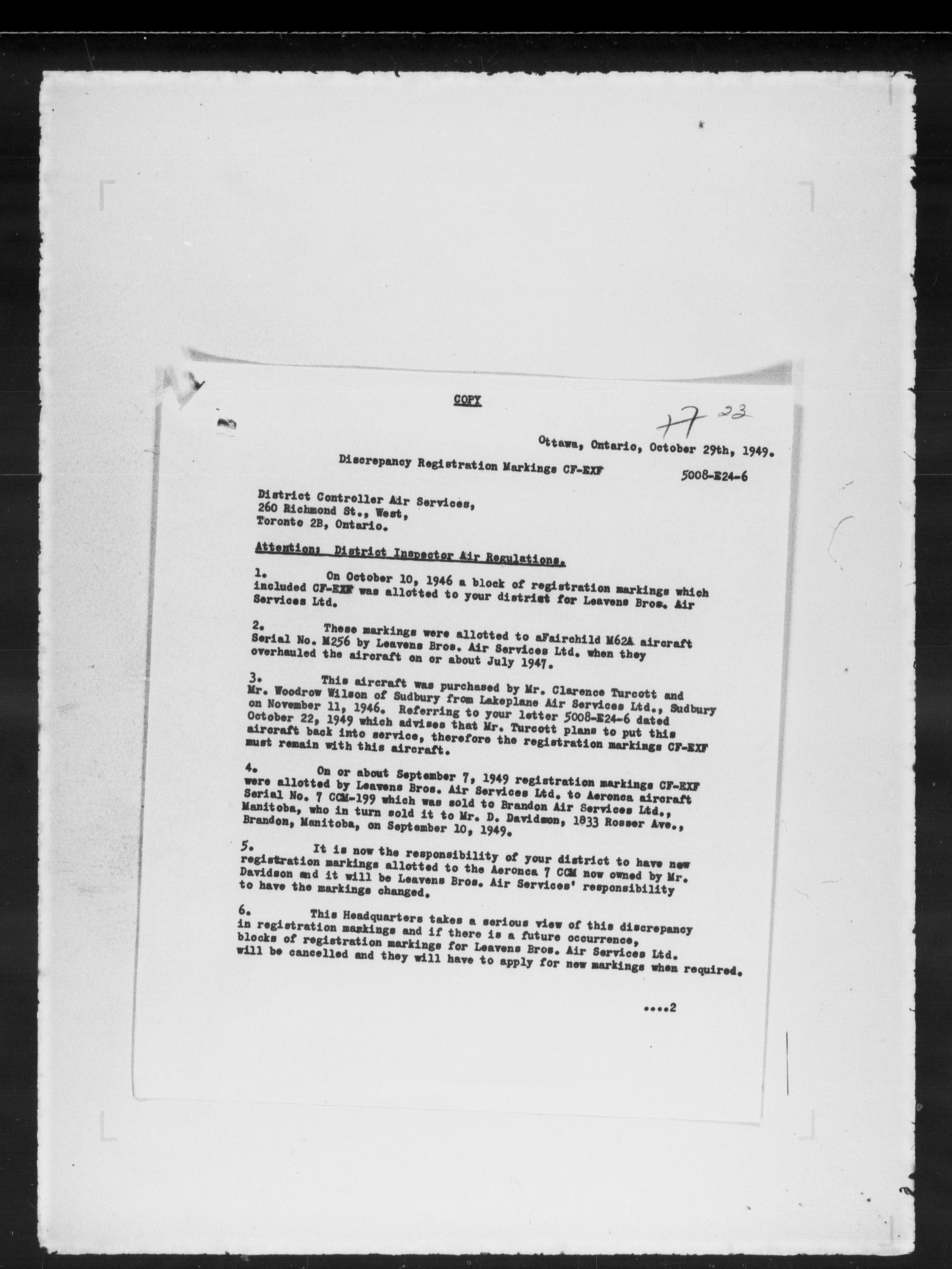 Department of Transport : Civil aircraft registration, inspection and operation files, 1920-1986 : T-7947