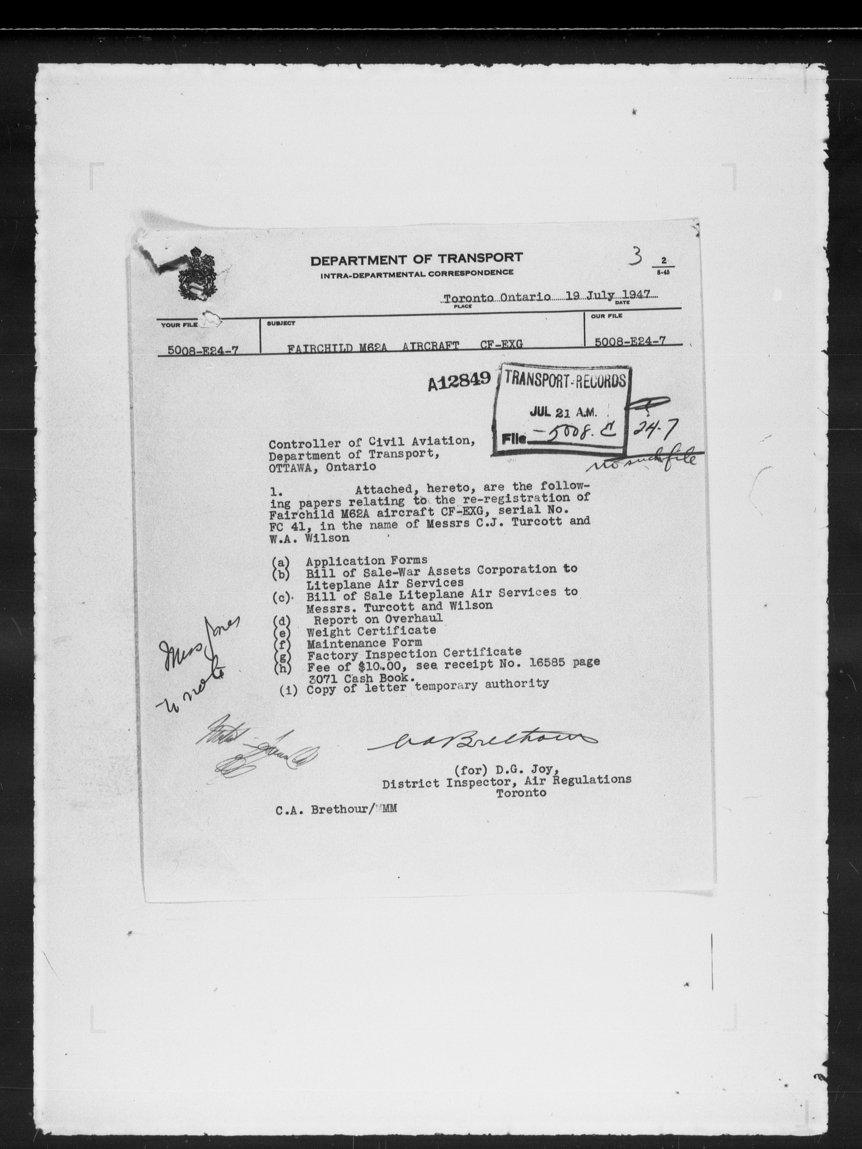 Department of Transport : Civil aircraft registration, inspection and operation files, block 5008, 1920-1986 - 7947