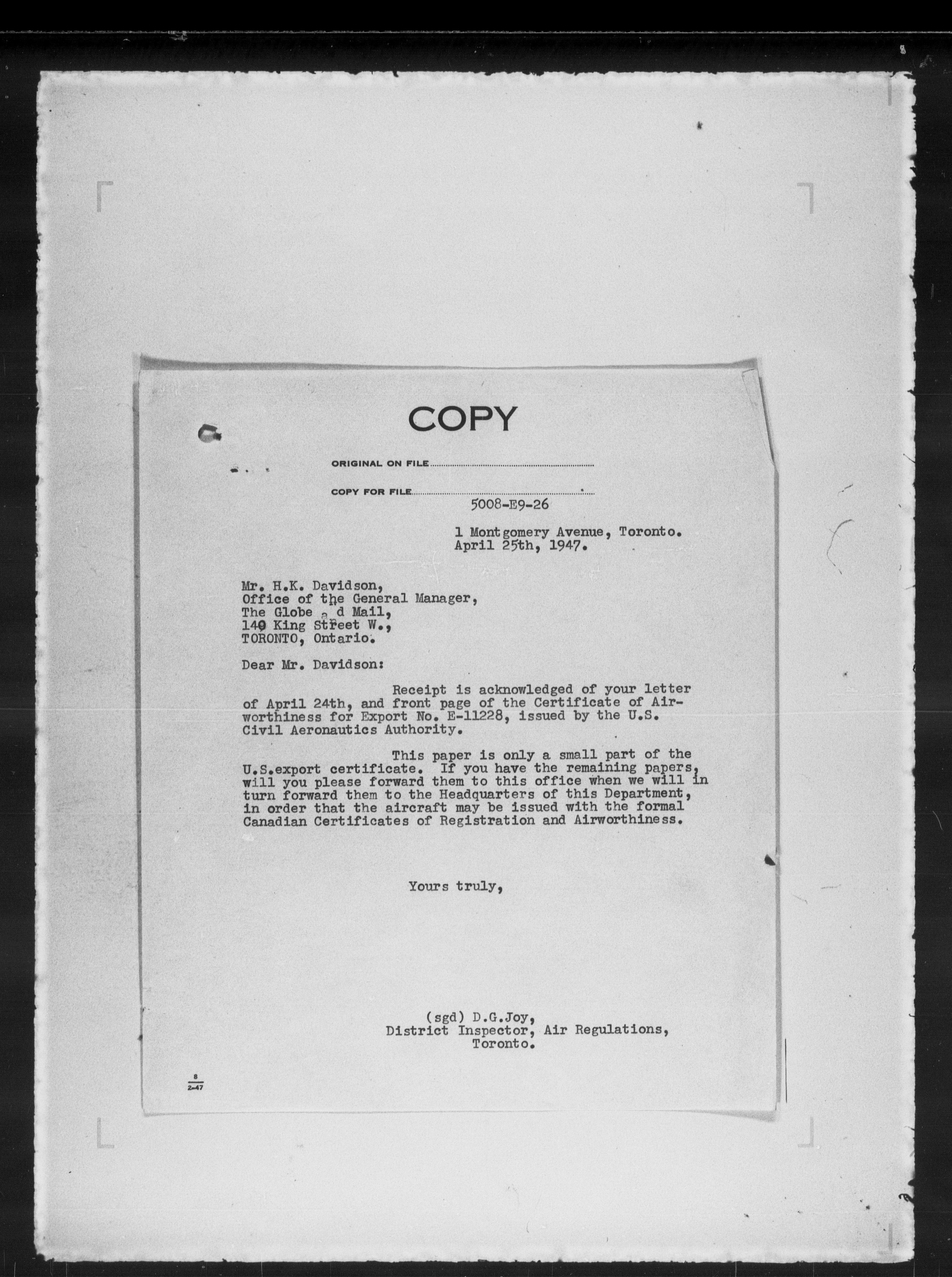 Department of Transport : Civil aircraft registration, inspection and operation files, 1920-1986 : T-7947