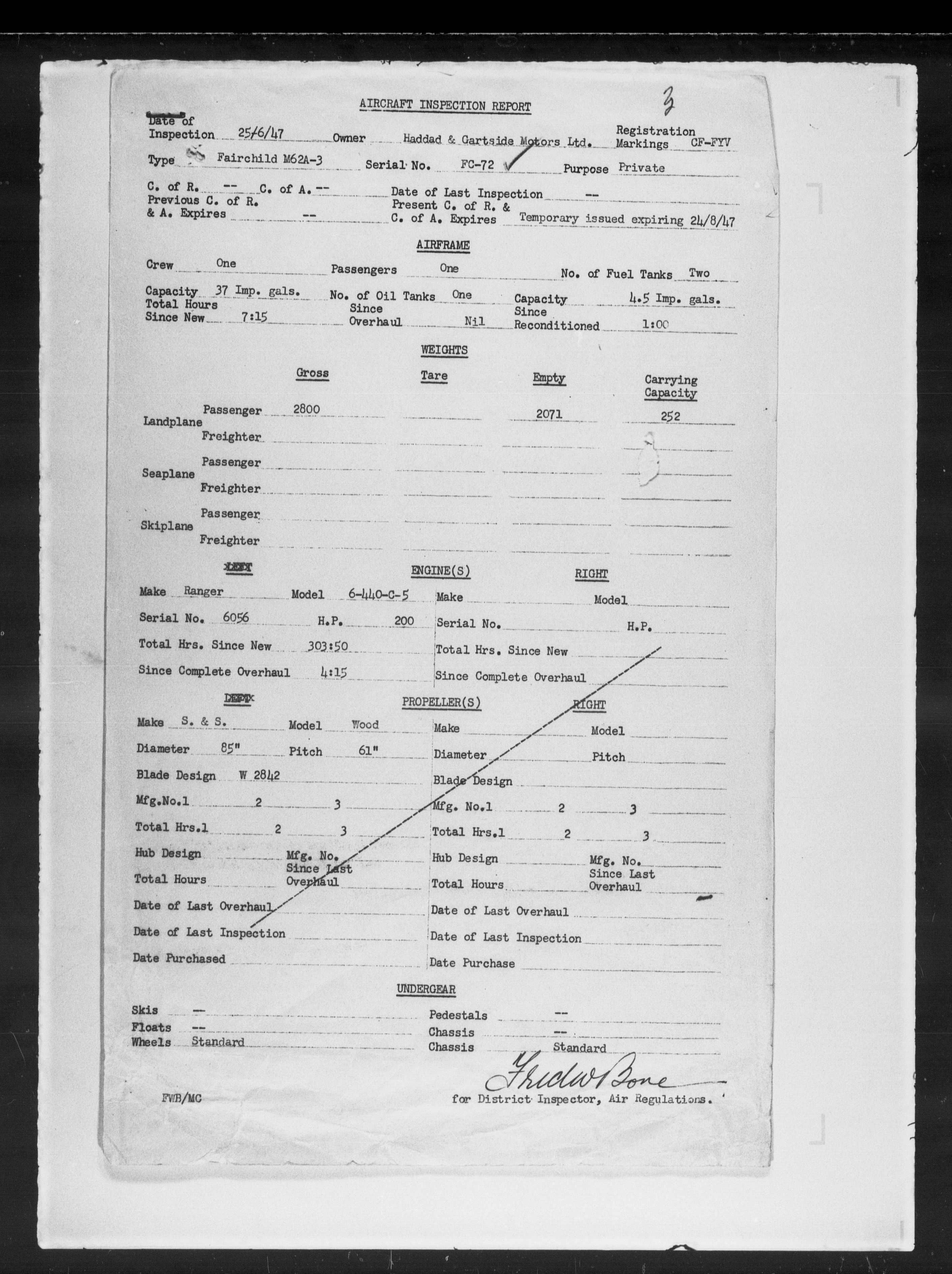 Department of Transport : Civil aircraft registration, inspection and operation files, 1920-1986 : T-7949
