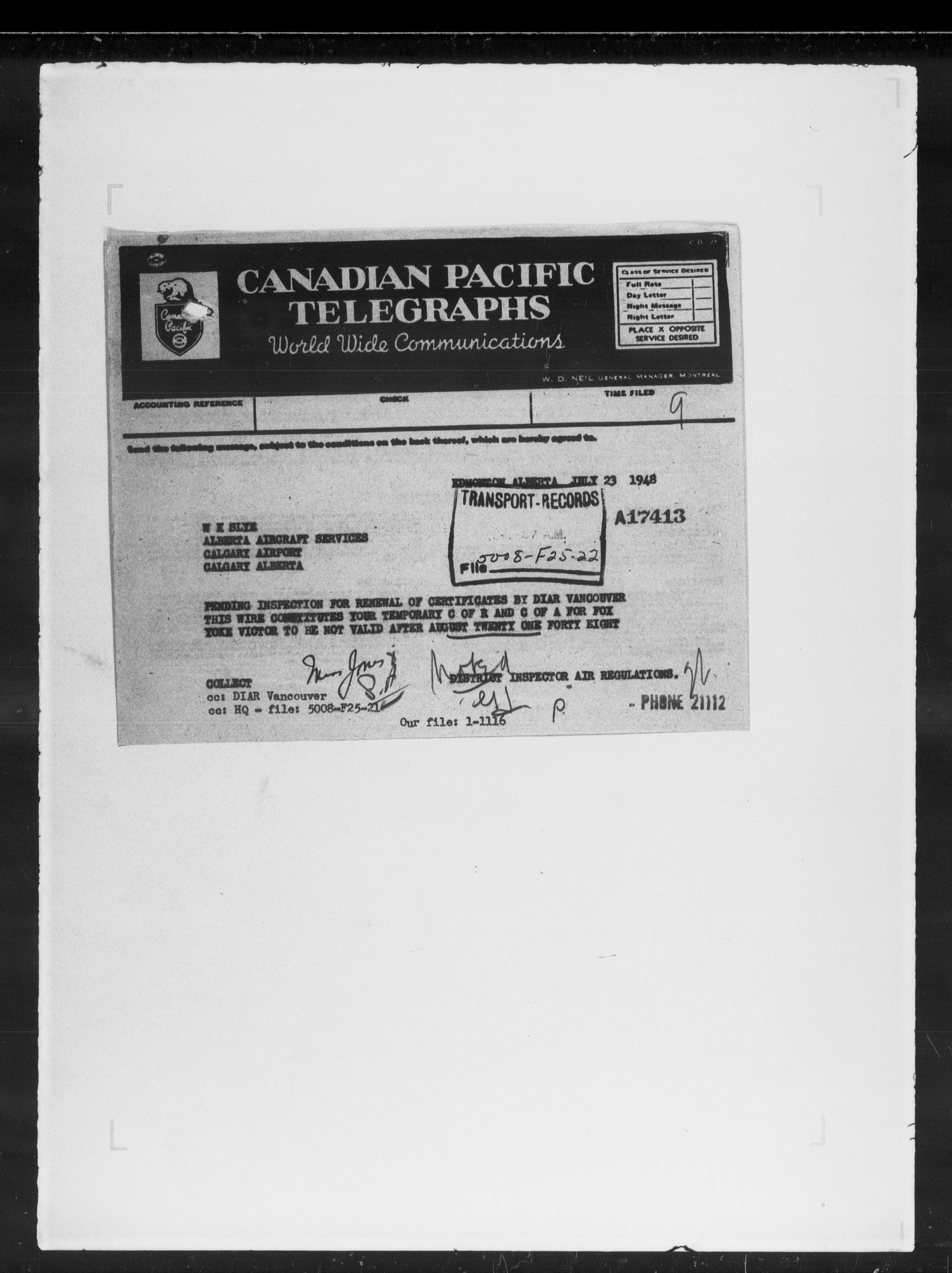 Department of Transport : Civil aircraft registration, inspection and operation files, block 5008, 1920-1986 - 7949