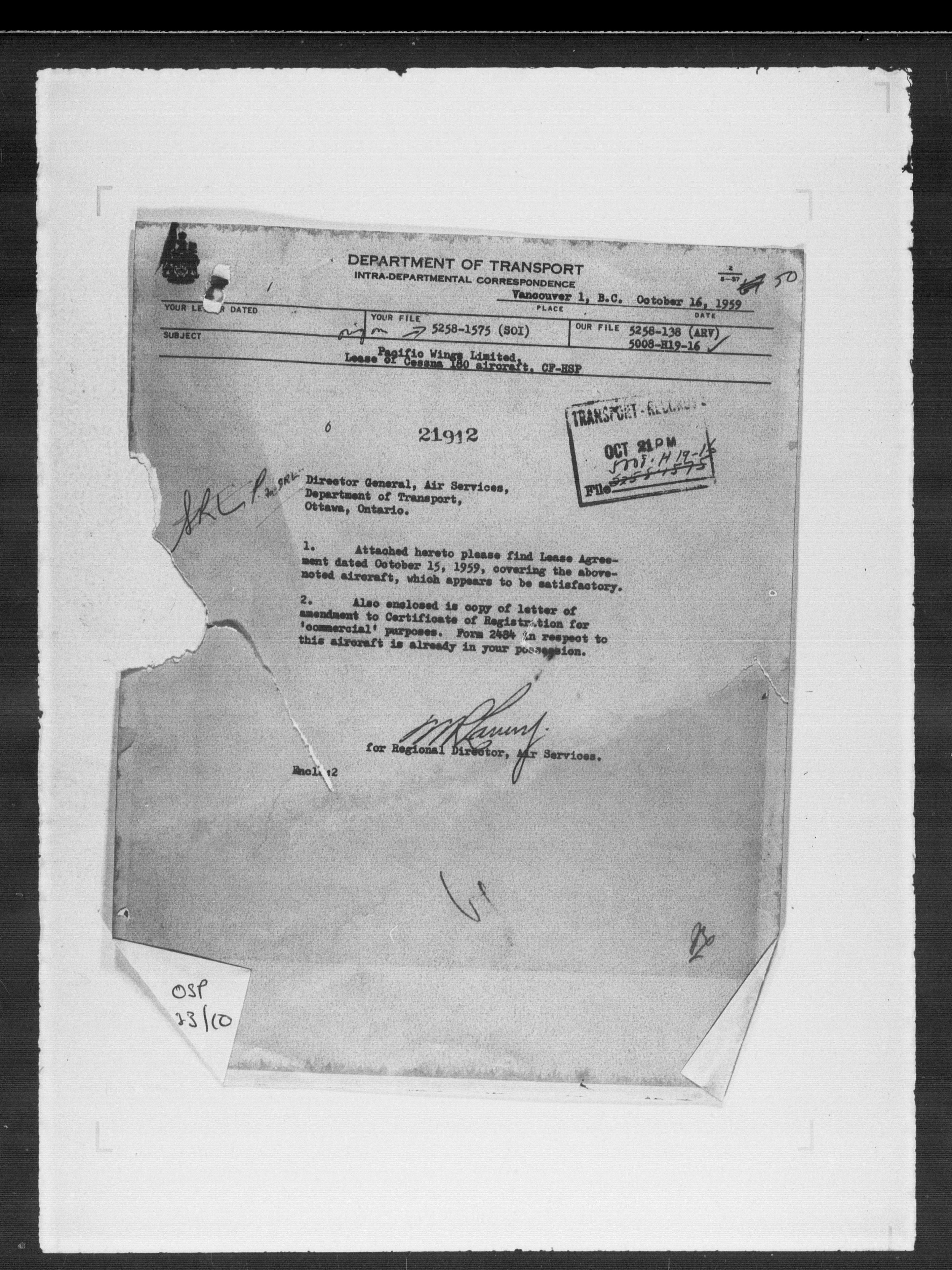 Department of Transport : Civil aircraft registration, inspection and operation files, 1920-1986 : T-7952