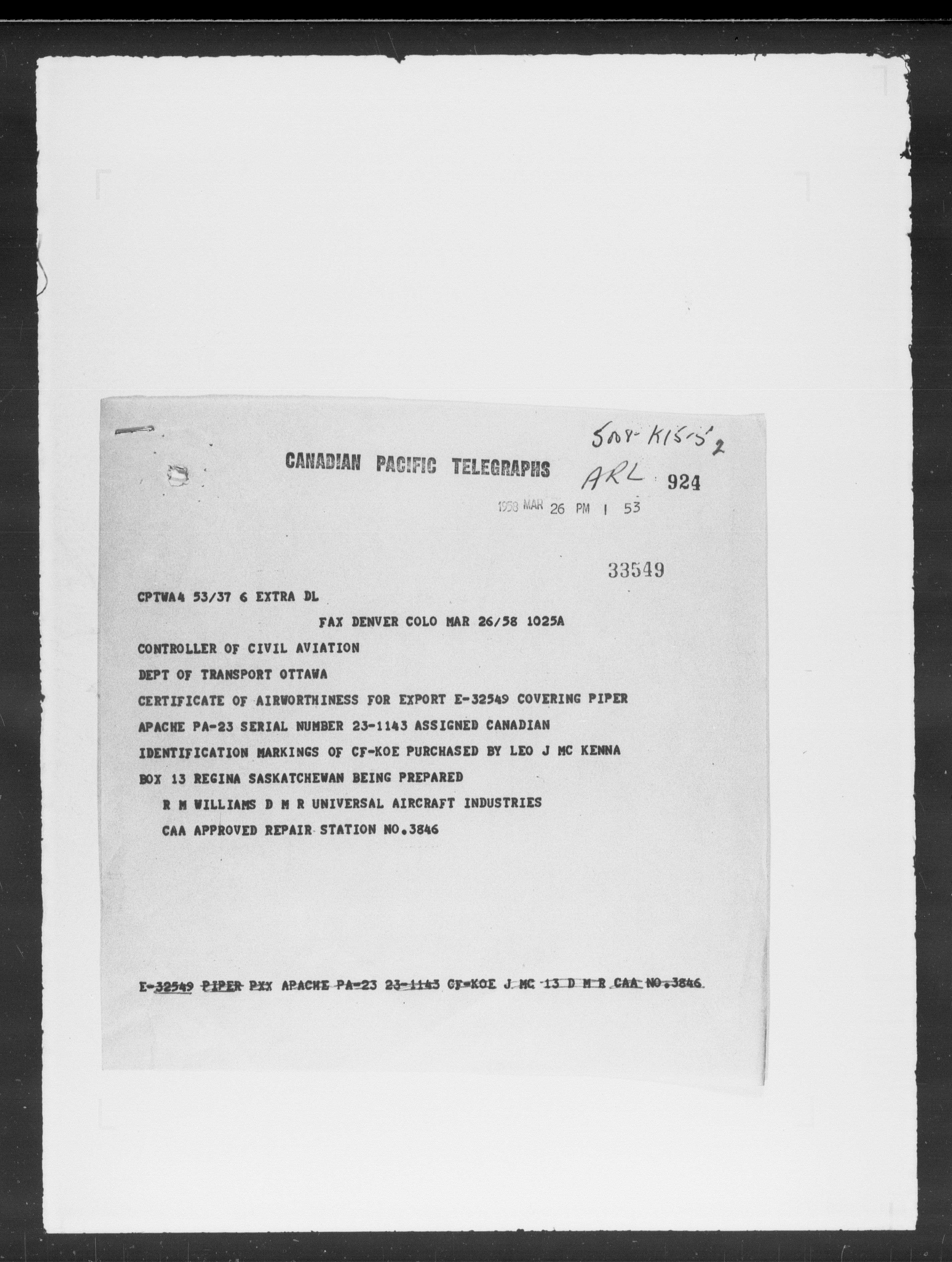 Department of Transport : Civil aircraft registration, inspection and operation files, block 5008, 1920-1986 - 7955