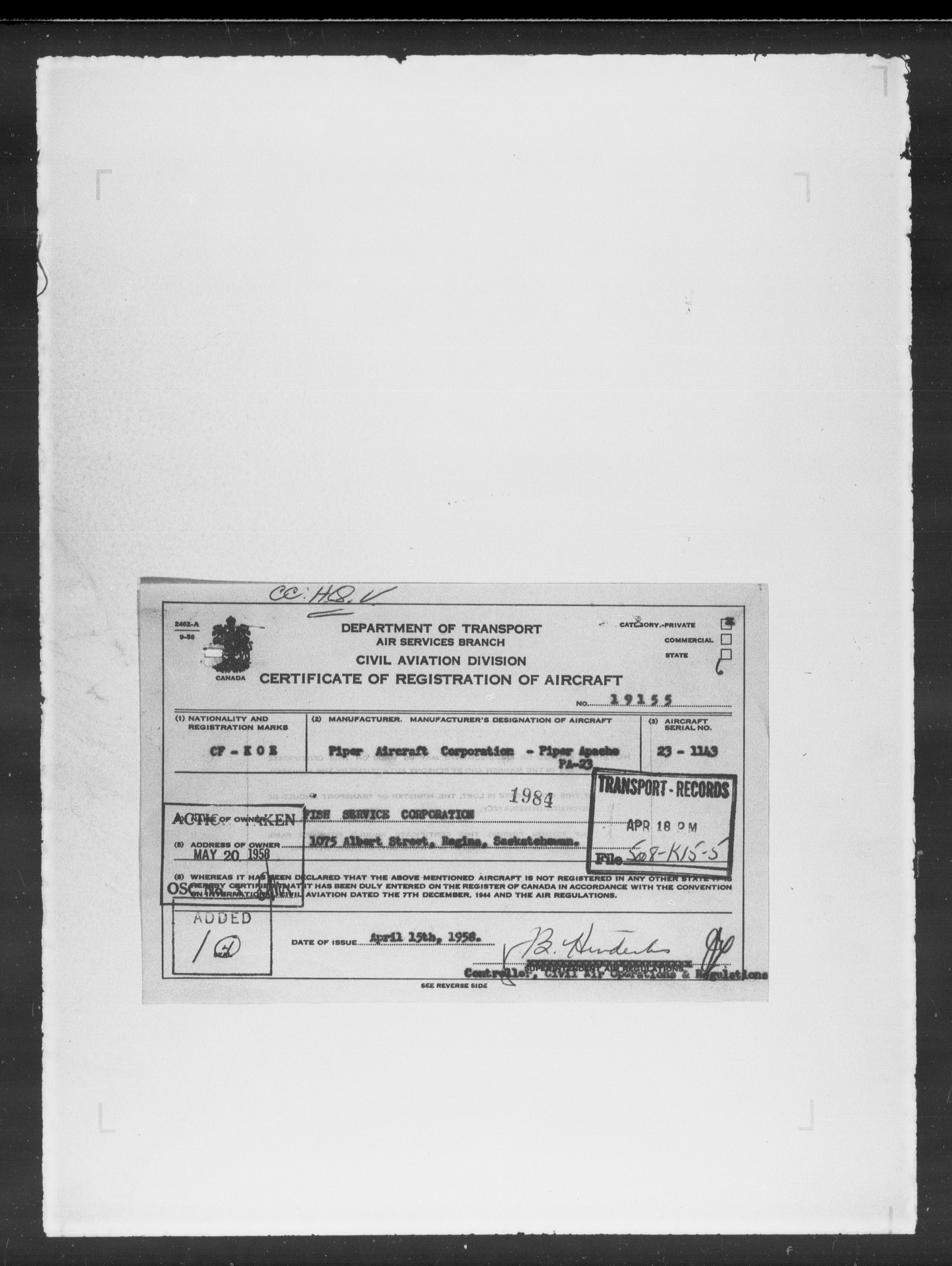 Department of Transport : Civil aircraft registration, inspection and operation files, block 5008, 1920-1986 - 7955