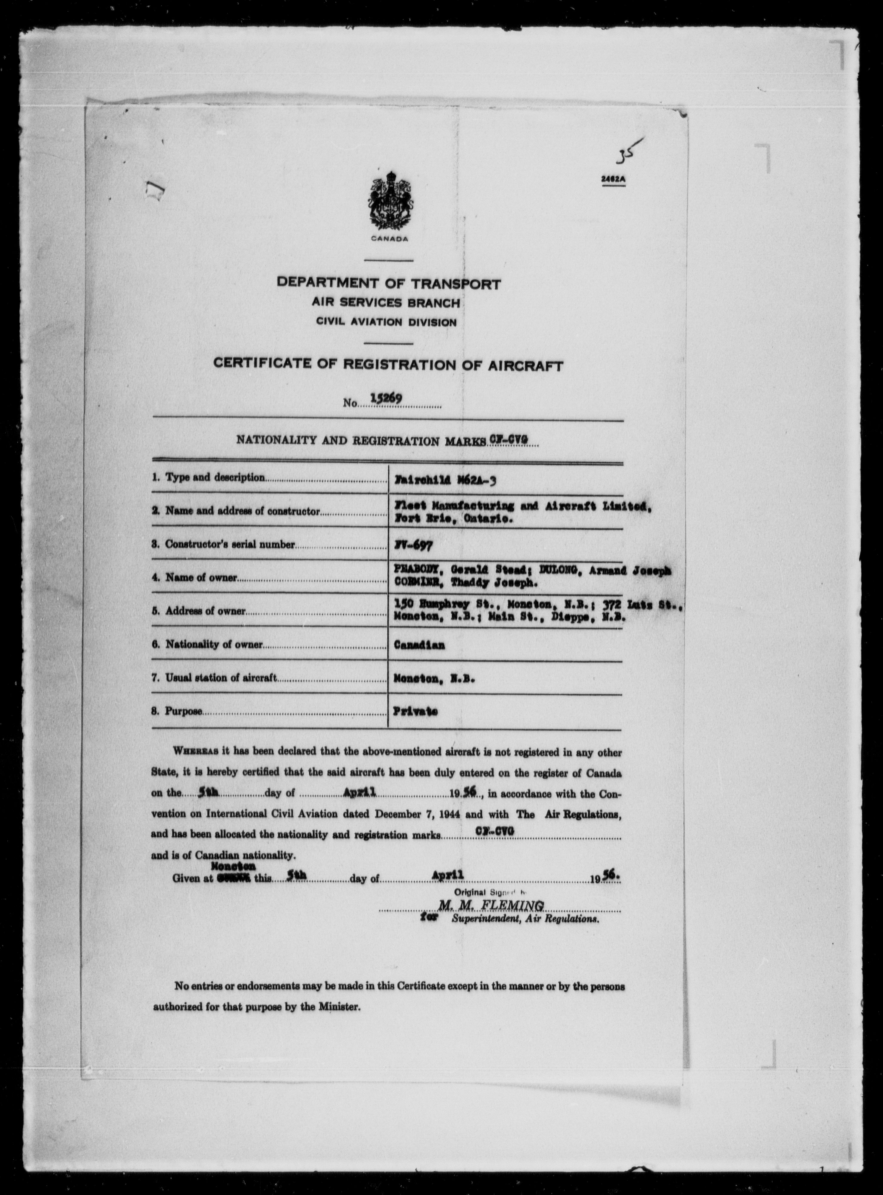 Department of Transport : Civil aircraft registration, inspection and operation files, 1920-1986 : T-7962