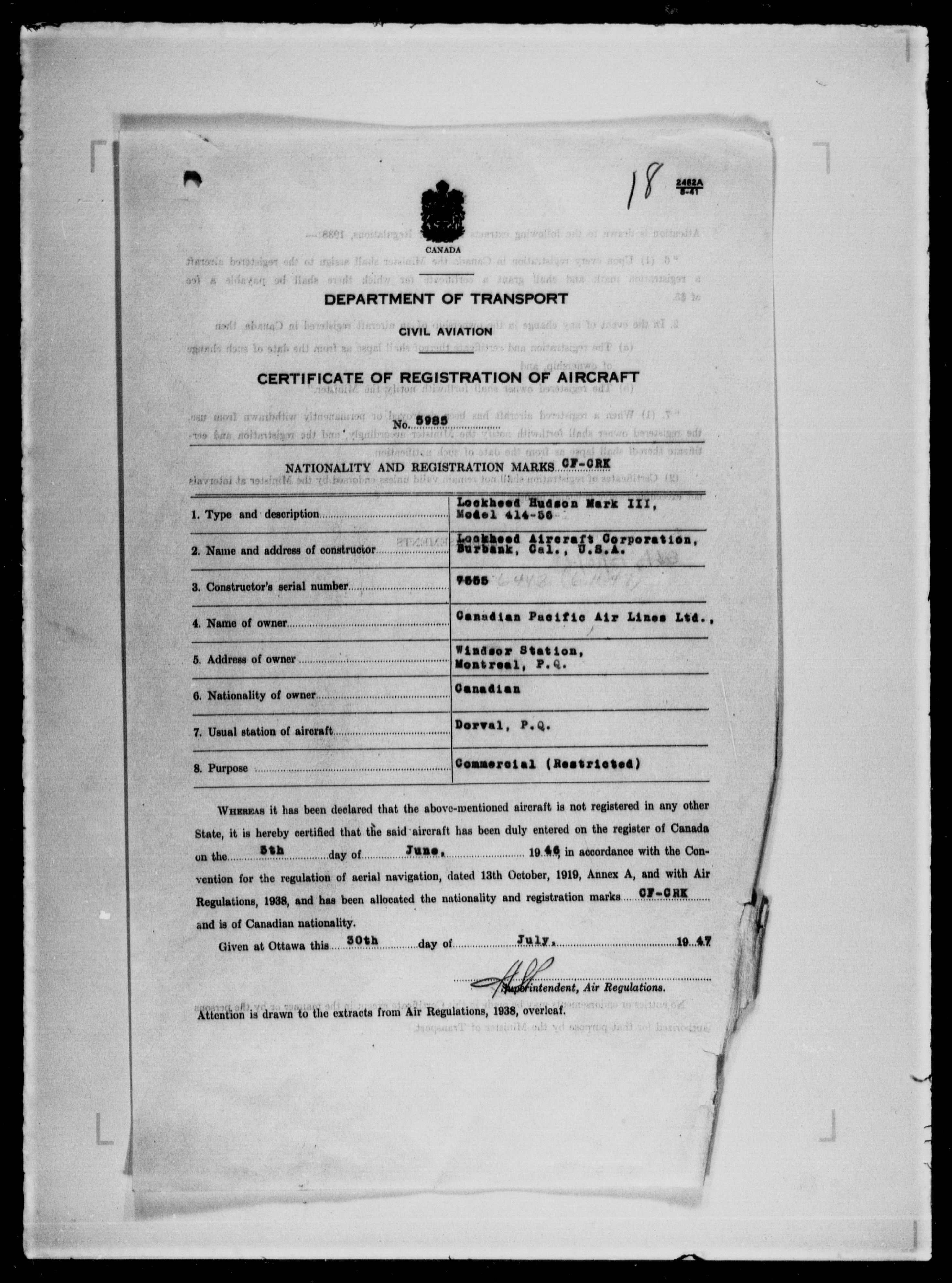 Department of Transport : Civil aircraft registration, inspection and operation files, block 5008, 1920-1986 - 7978