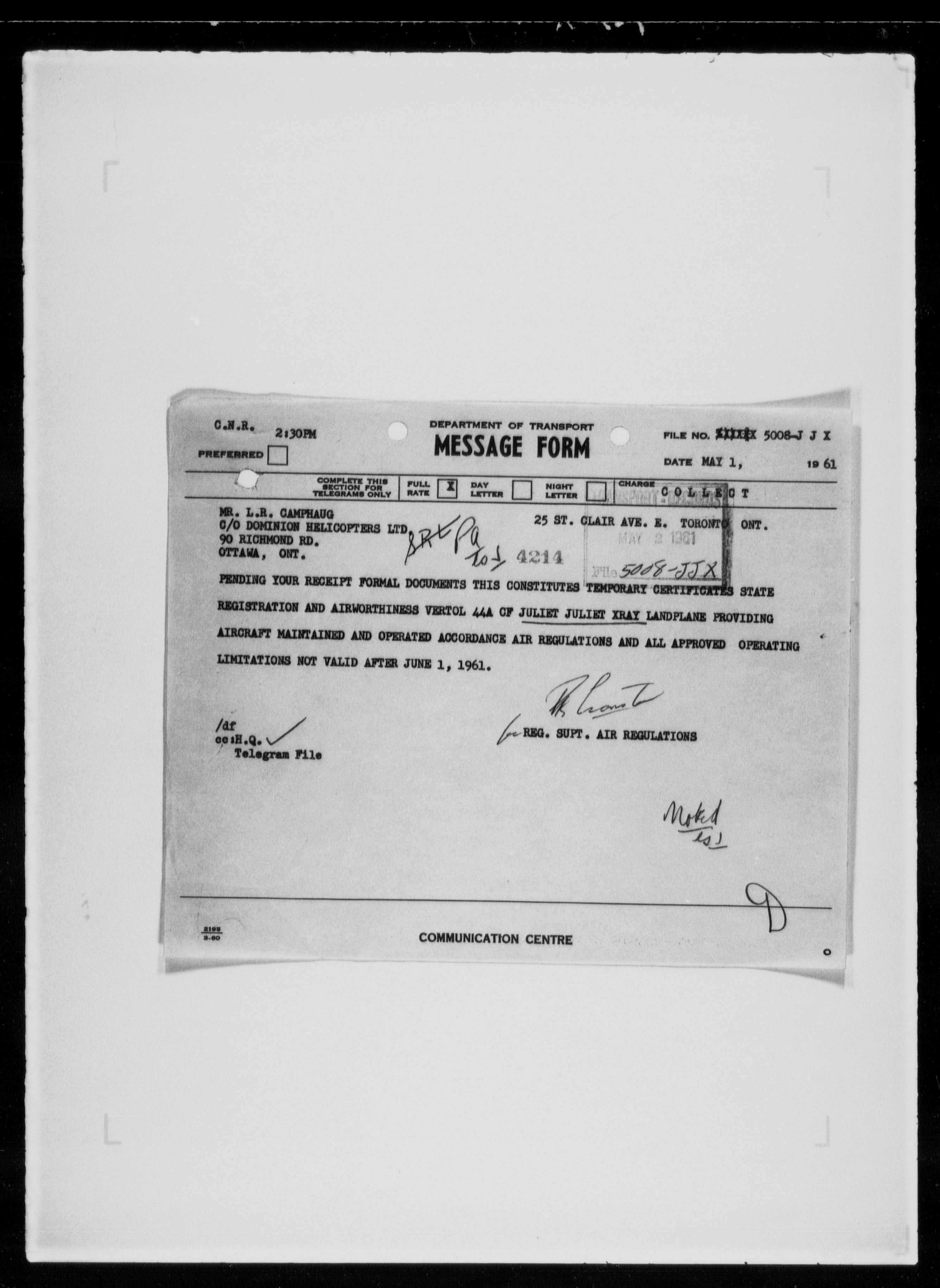 Department of Transport : Civil aircraft registration, inspection and operation files, 1920-1986 : T-7982