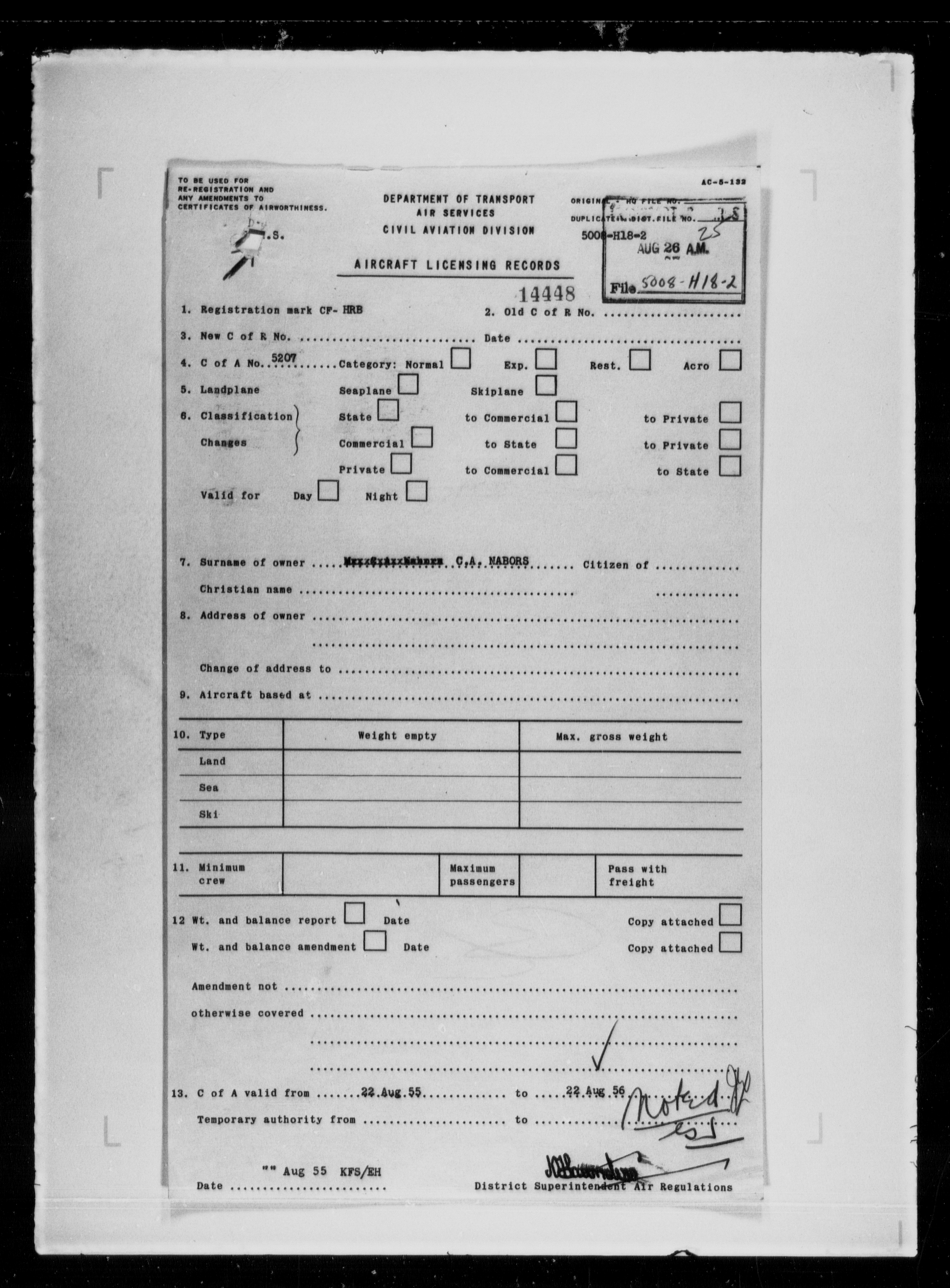 Department of Transport : Civil aircraft registration, inspection and operation files, block 5008, 1920-1986 (Cancelled Aircraft Registry Files, CF HJK to KLI) - 8006