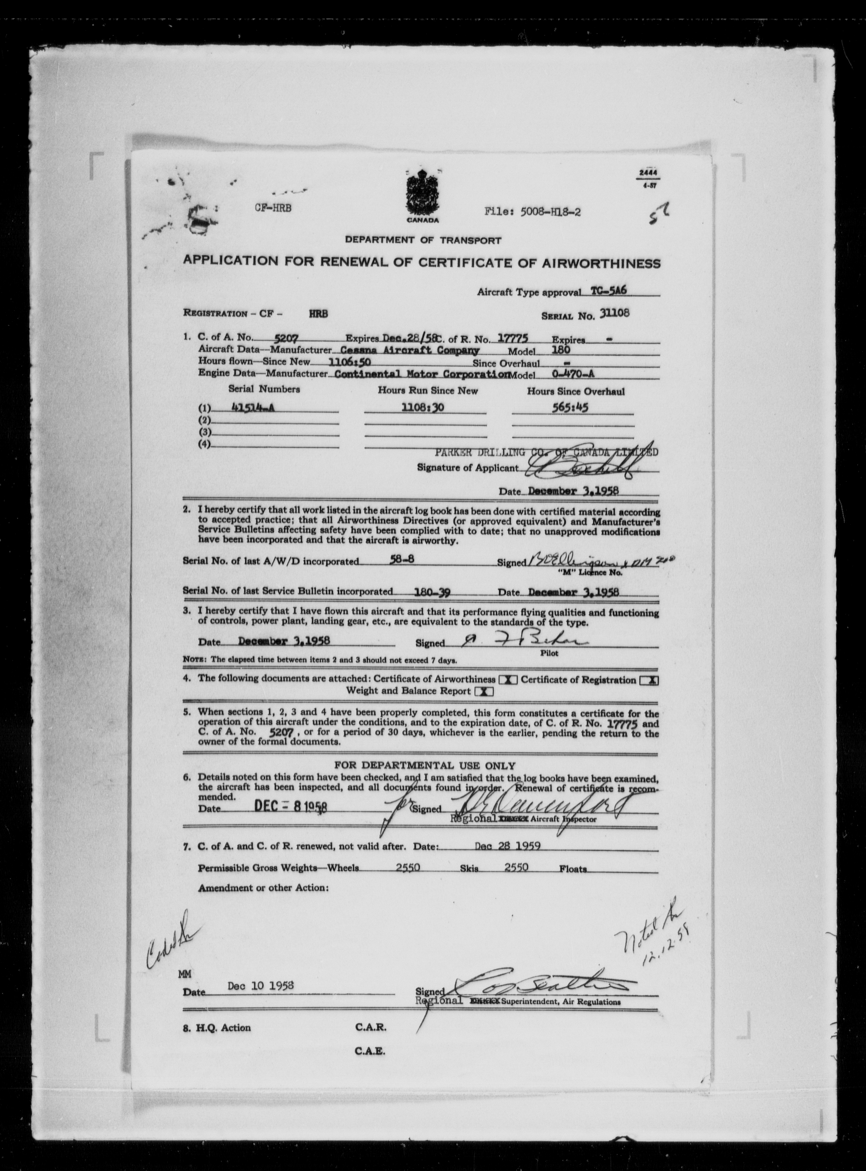 Department of Transport : Civil aircraft registration, inspection and operation files, block 5008, 1920-1986 (Cancelled Aircraft Registry Files, CF HJK to KLI) - 8006