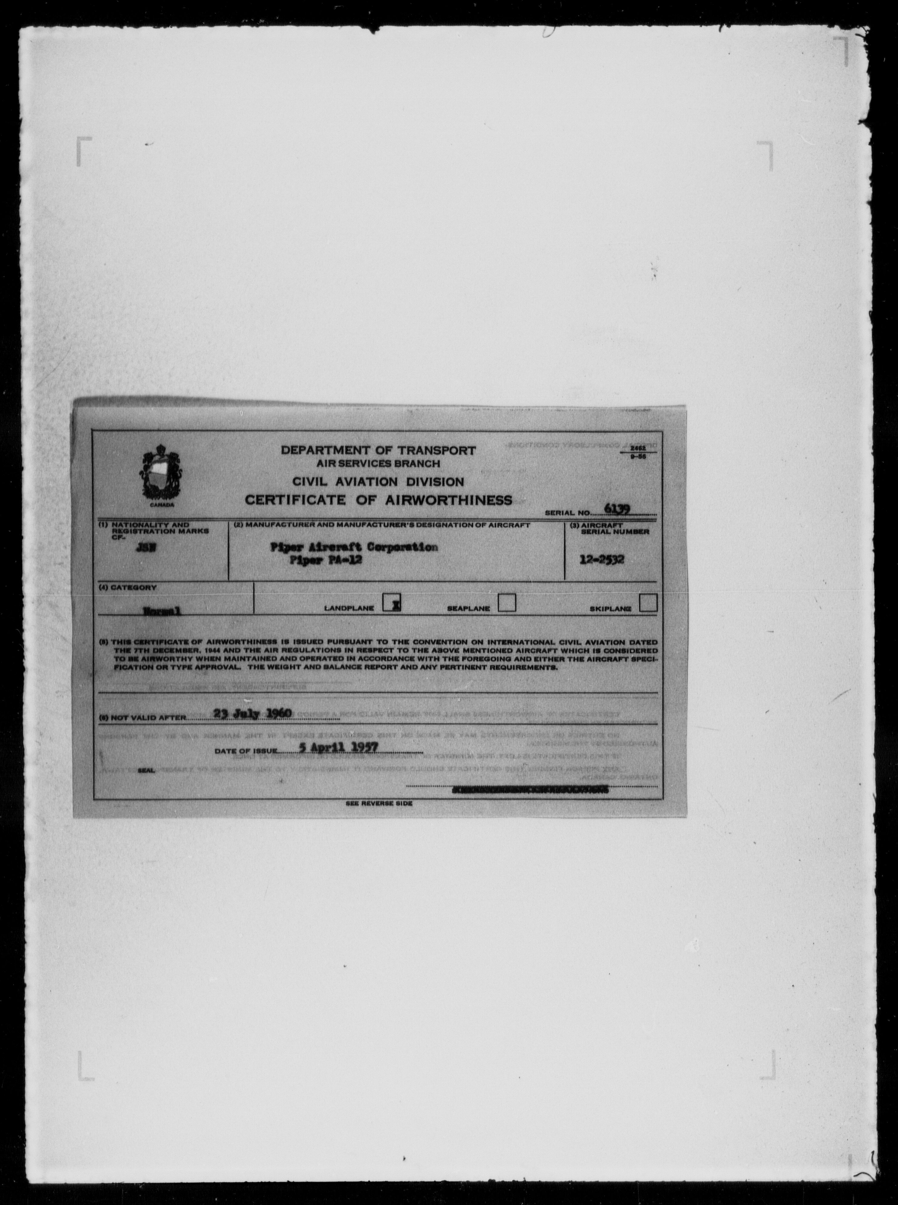Department of Transport : Civil aircraft registration, inspection and operation files, 1920-1986 : T-8023