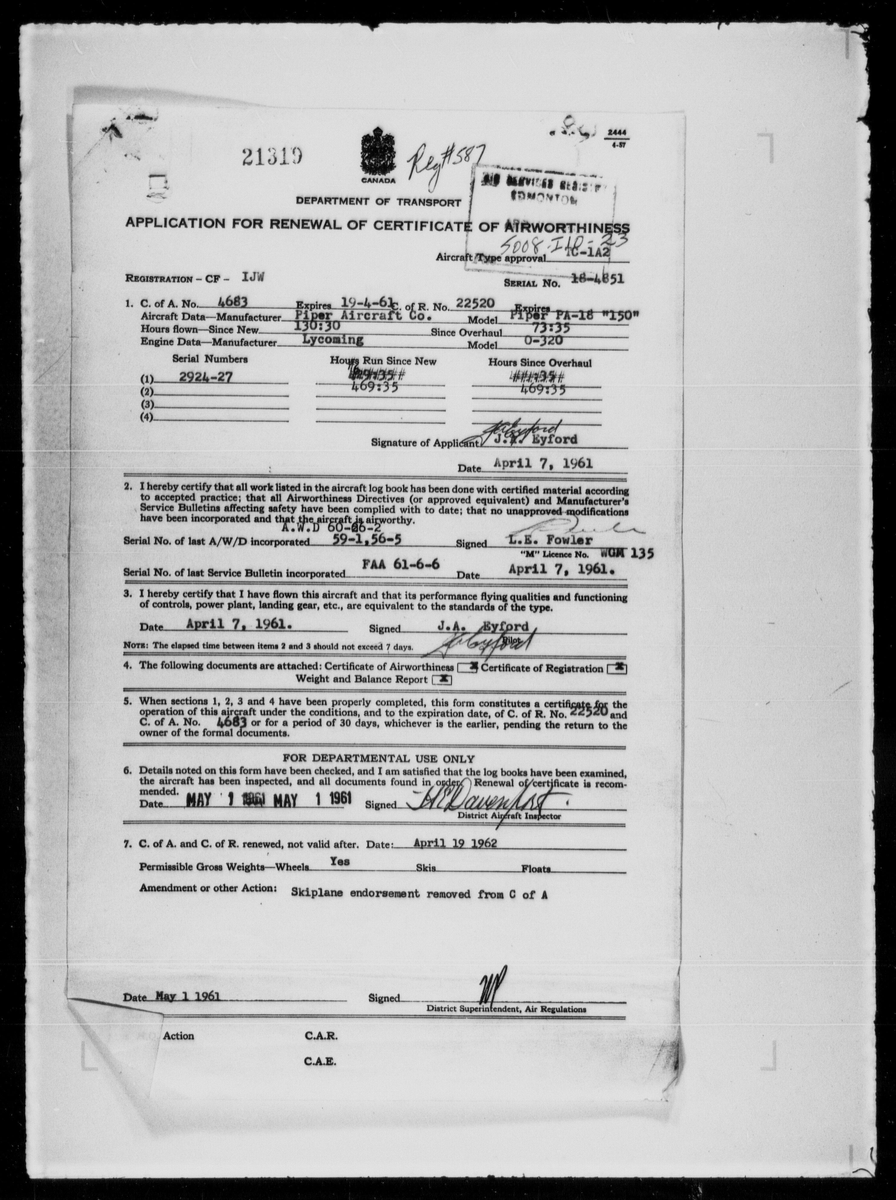 Department of Transport : Civil aircraft registration, inspection and operation files, block 5008, 1920-1986 - T-8023
