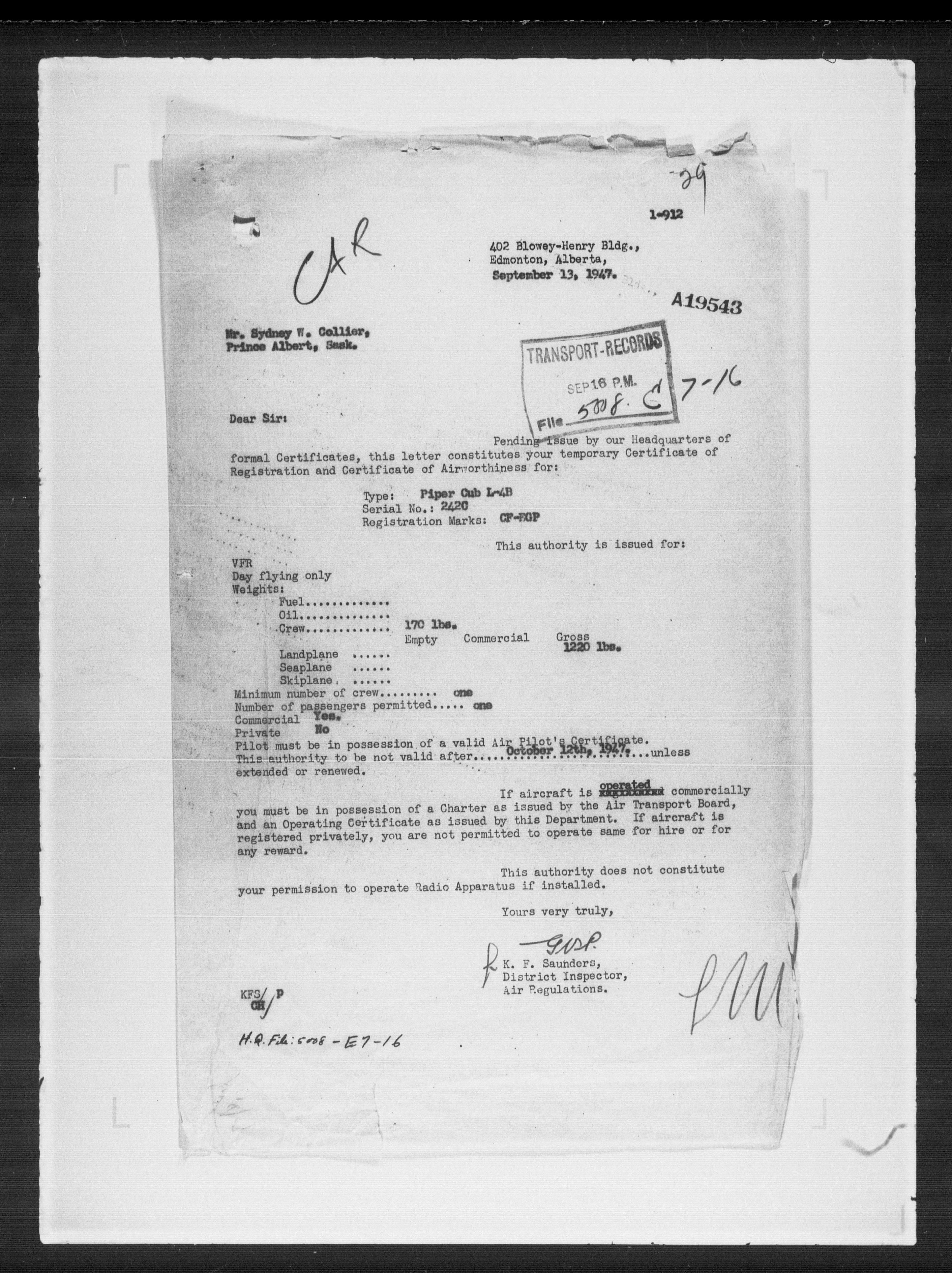 Department of Transport : Civil aircraft registration, inspection and operation files, 1920-1986 : T-8041