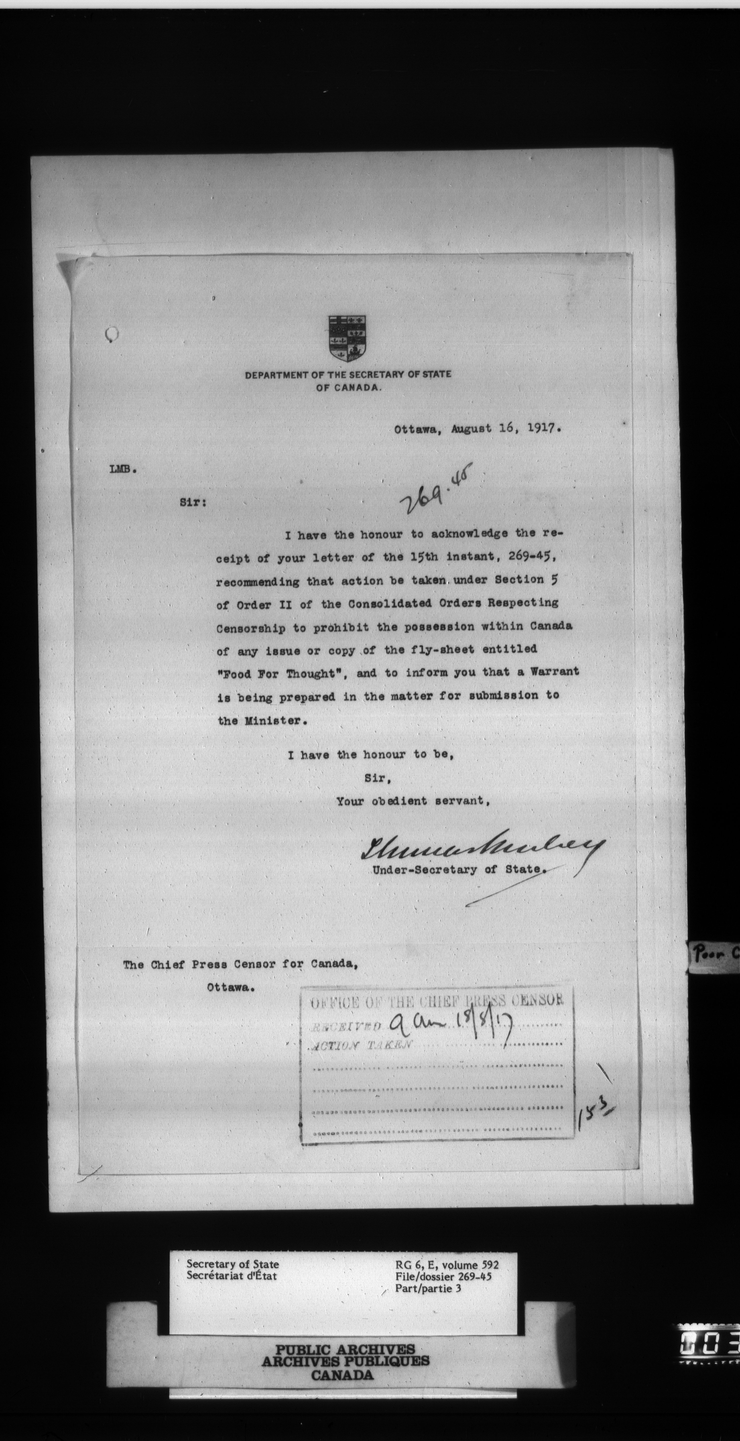 Secretary of State : Chief Press Censor, 1915-1920 - 82
