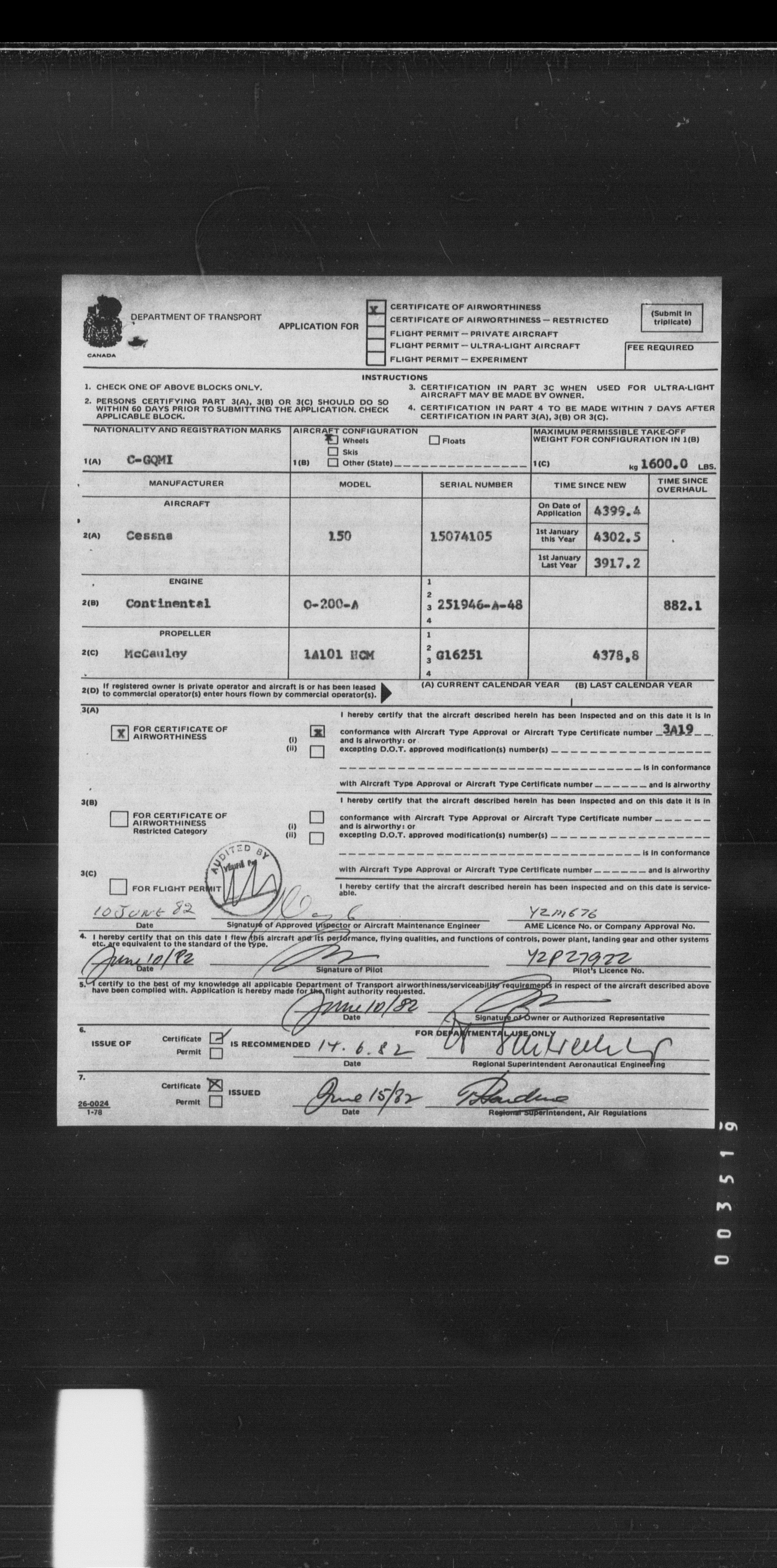 Department of Transport : Civil aircraft registration, inspection and operation files, block 5008, 1920-1986 - 8435