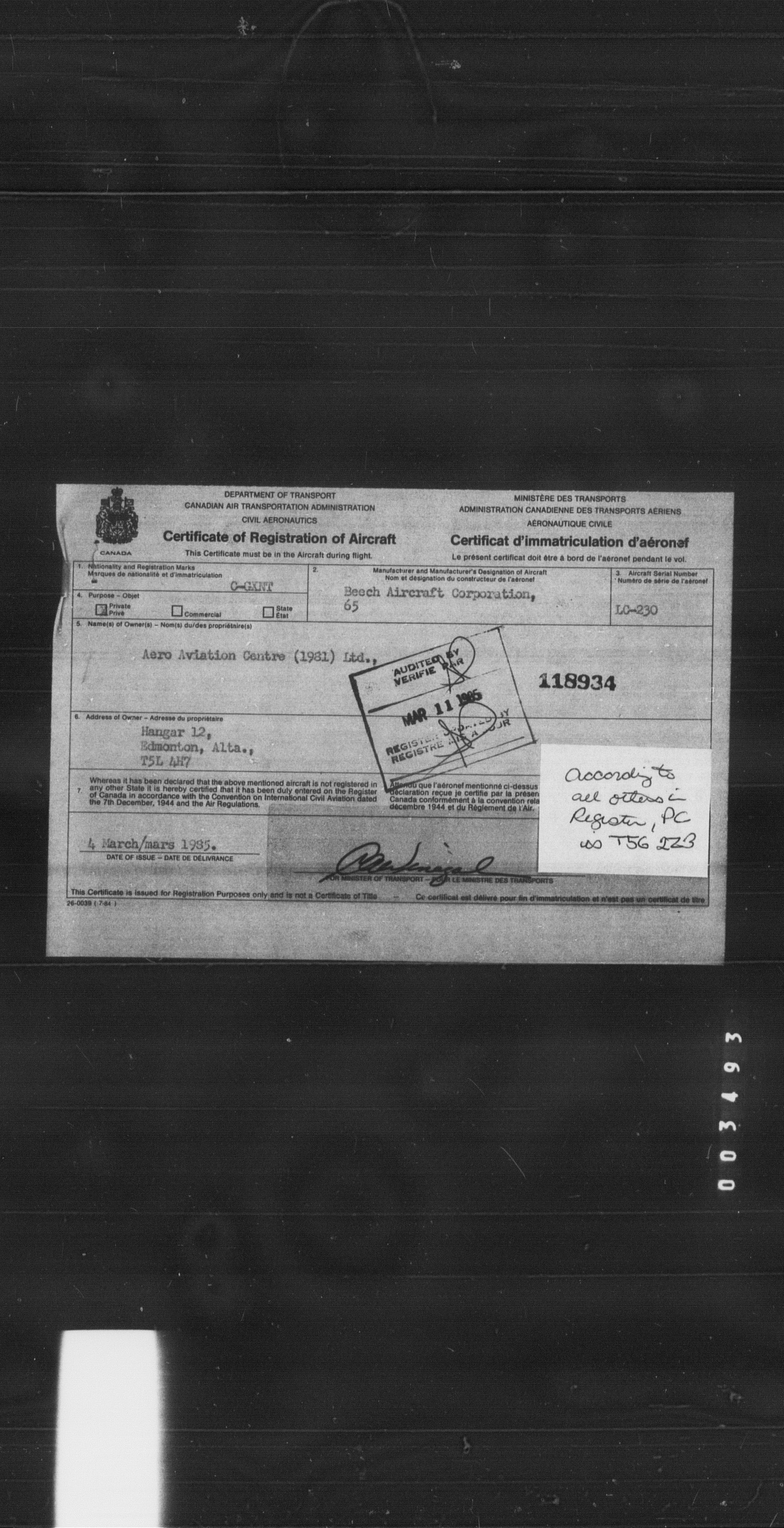 Department of Transport : Civil aircraft registration, inspection and operation files, 1920-1986 : T-8437