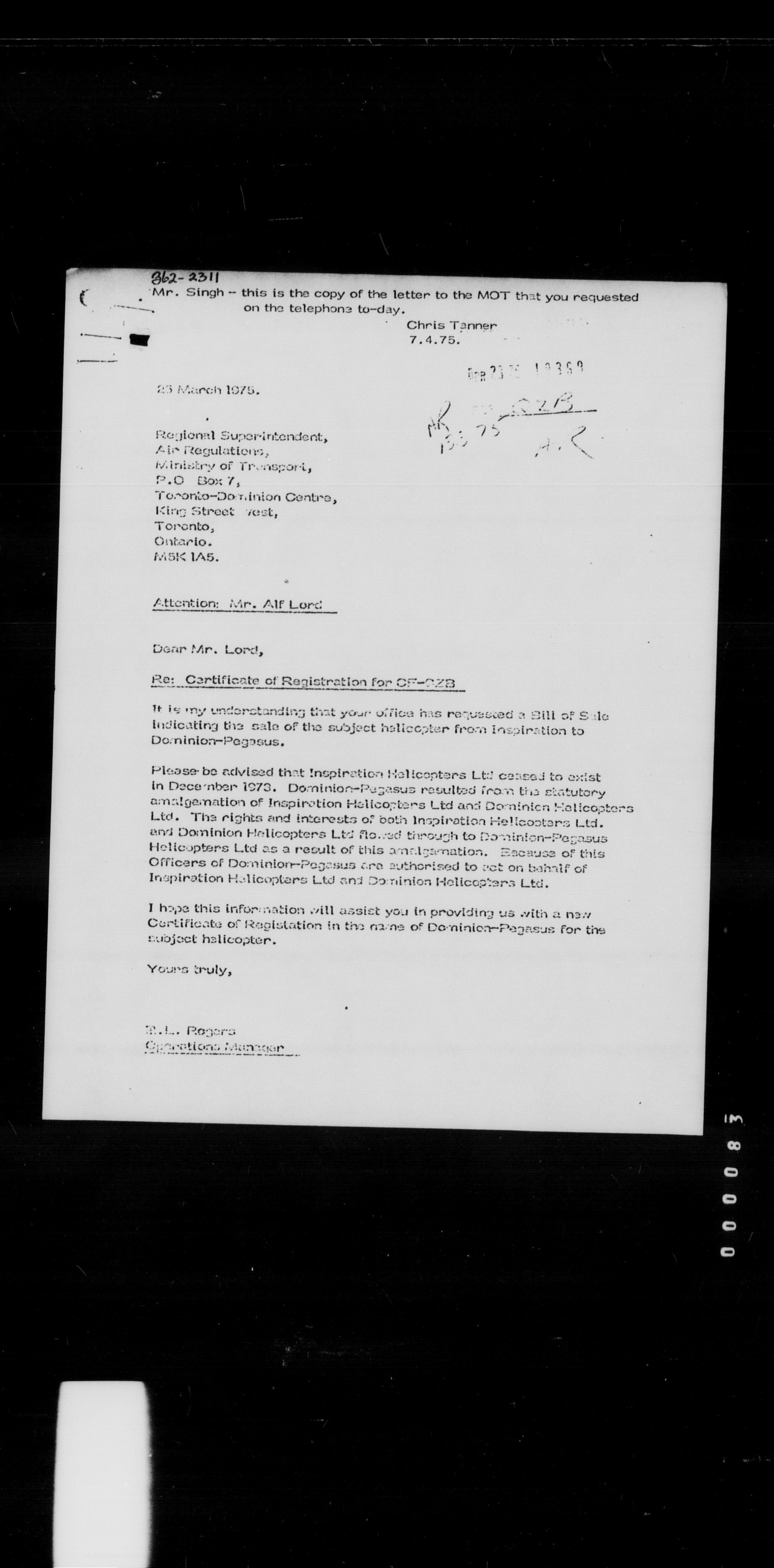 Department of Transport : Civil aircraft registration, inspection and operation files, block 5008, 1920-1986 - 8455