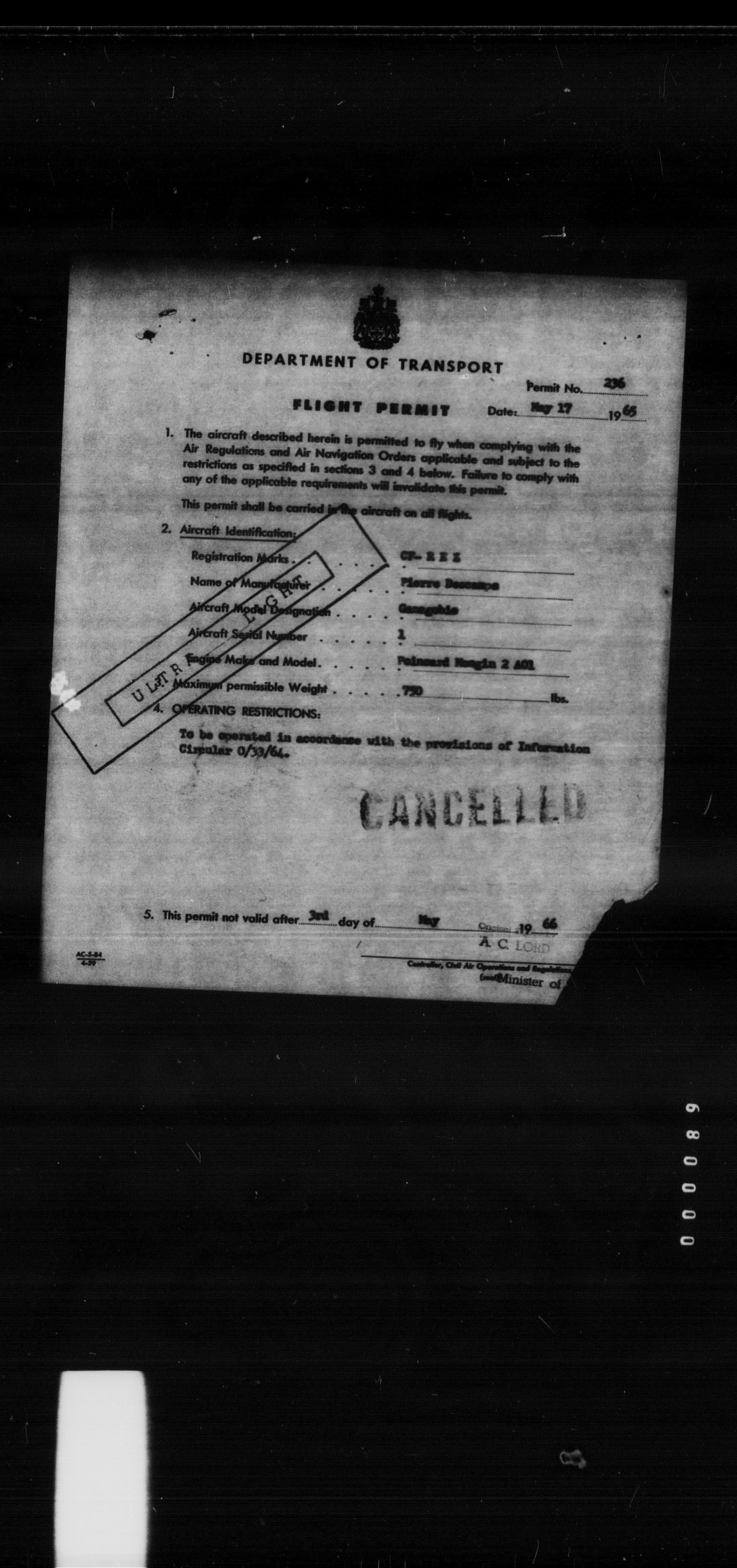 Department of Transport : Civil aircraft registration, inspection and operation files, block 5008, 1920-1986 - 8485