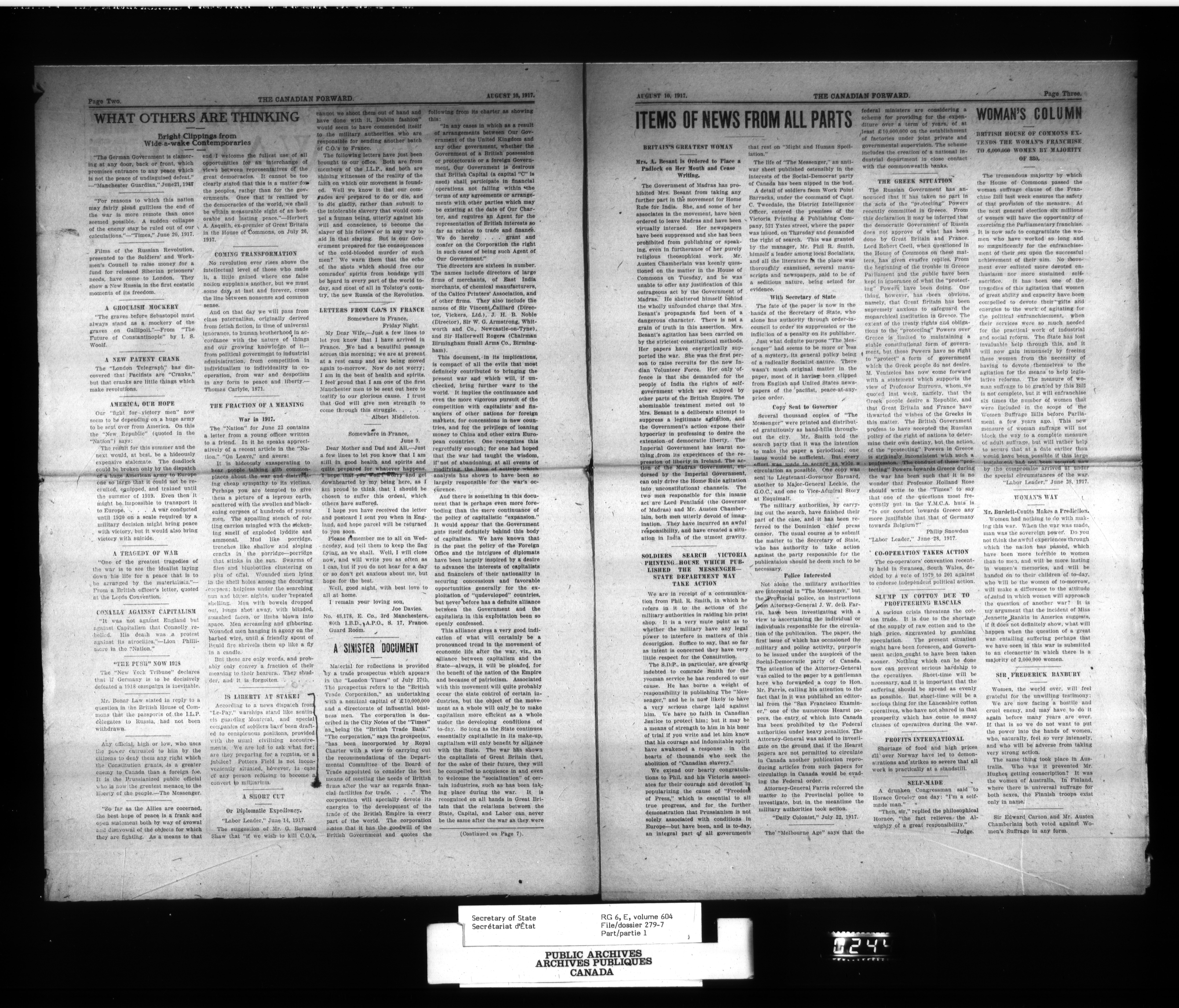 Secretary of State : Chief Press Censor, 1915-1920 - 91