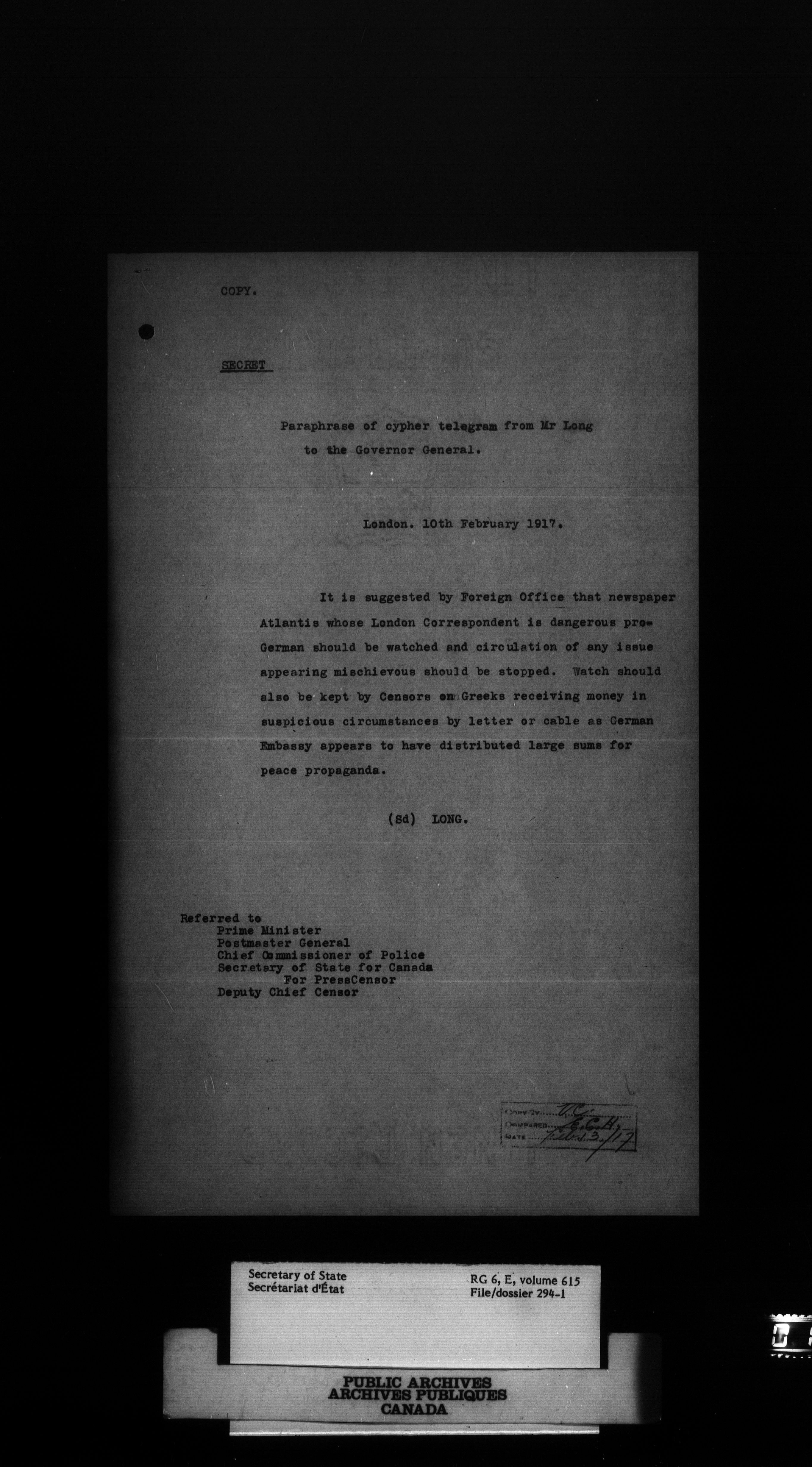 Secretary of State : Chief Press Censor, 1915-1920 - 98