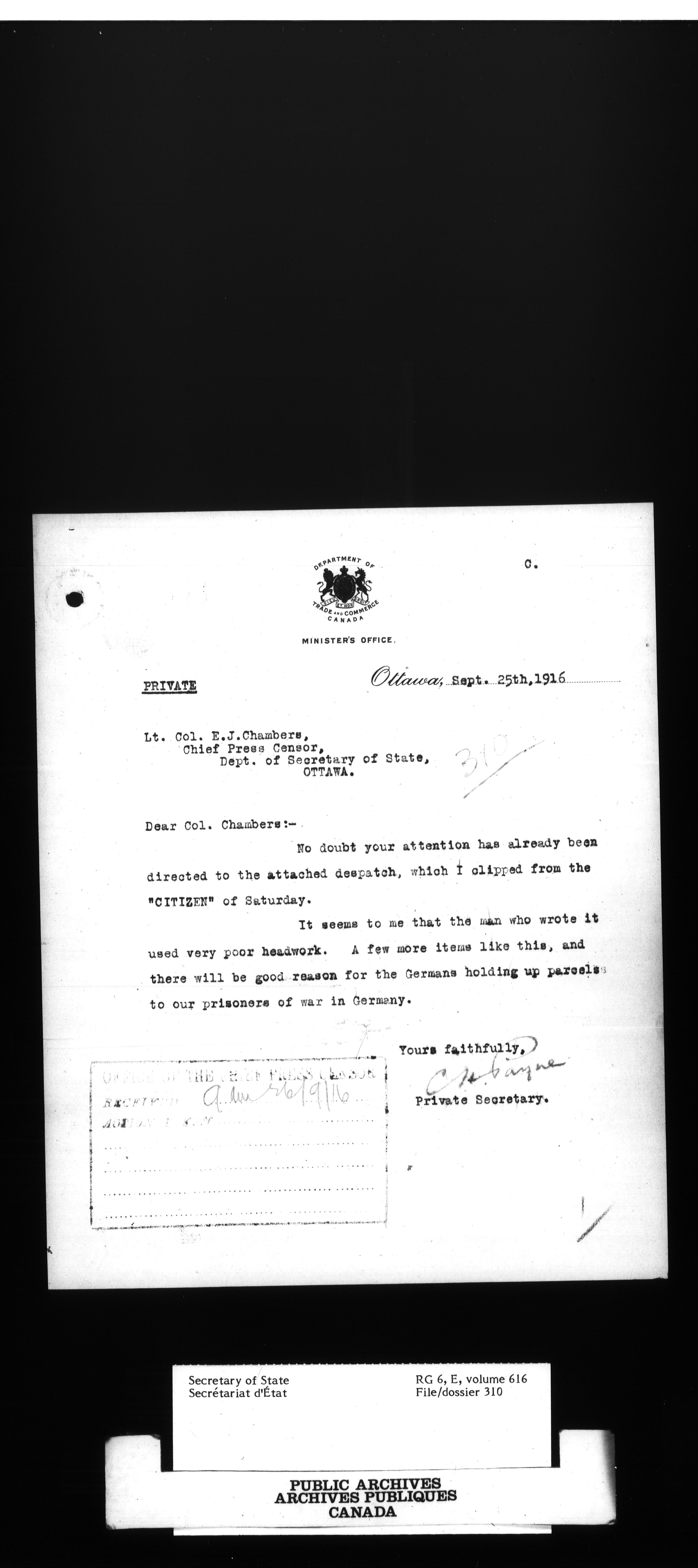 Secretary of State : Chief Press Censor, 1915-1920 - 99