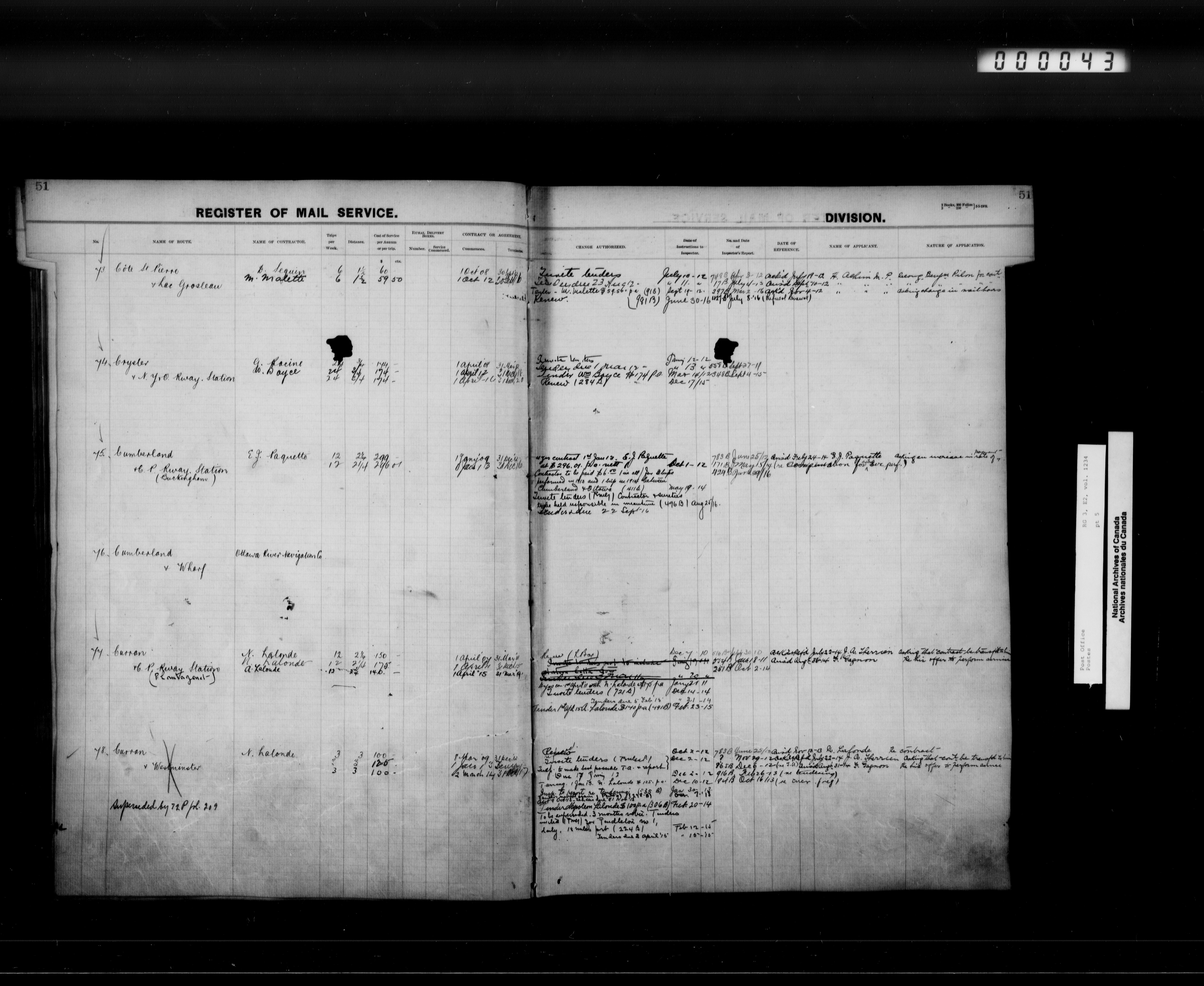 Post Office Department, Transportation Branch : Mail service contract registers, 1839-1980 - 9944
