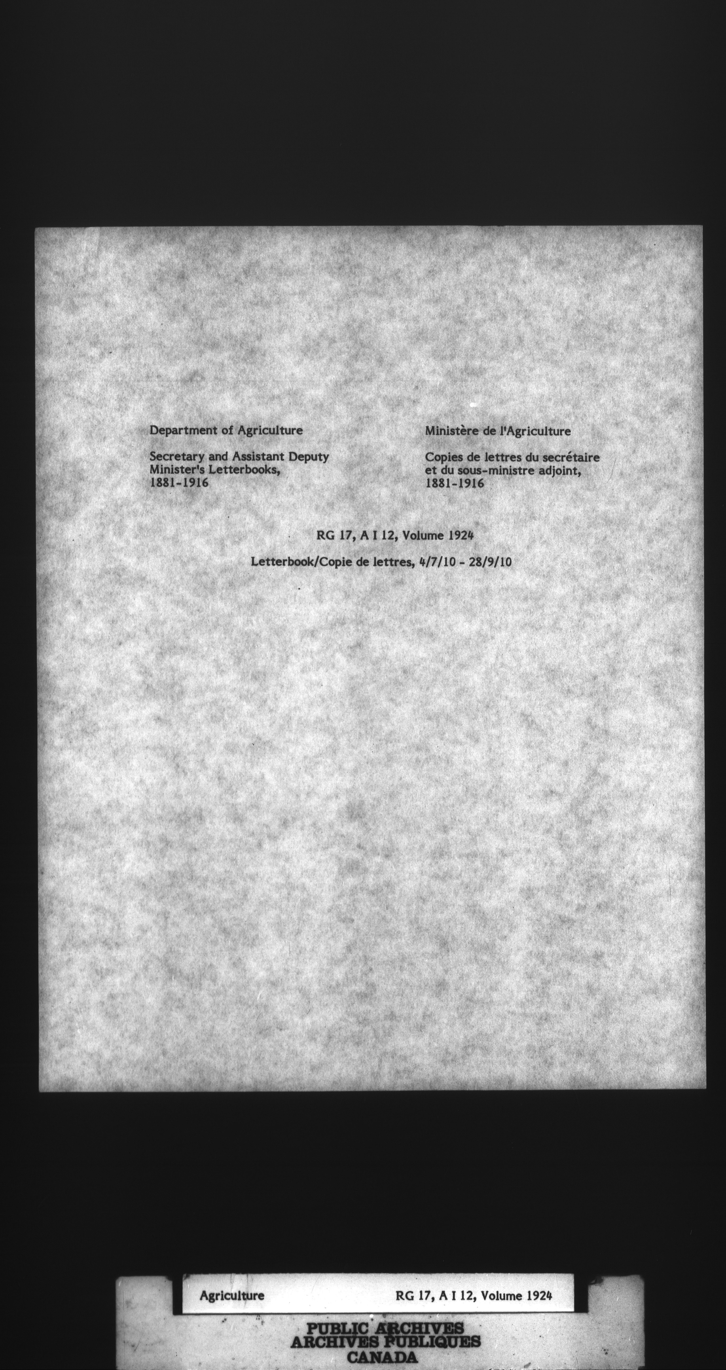 Department of Agriculture : Secretary and Assistant Deputy Minister's letterbooks, 1881-1916 : T-998